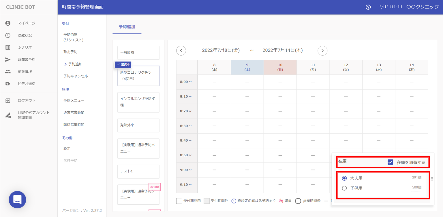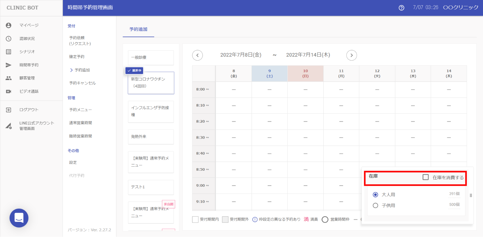 - 在庫管理機能を使用する予約メニューで予約追加を行う (目安時間 : 10~分)