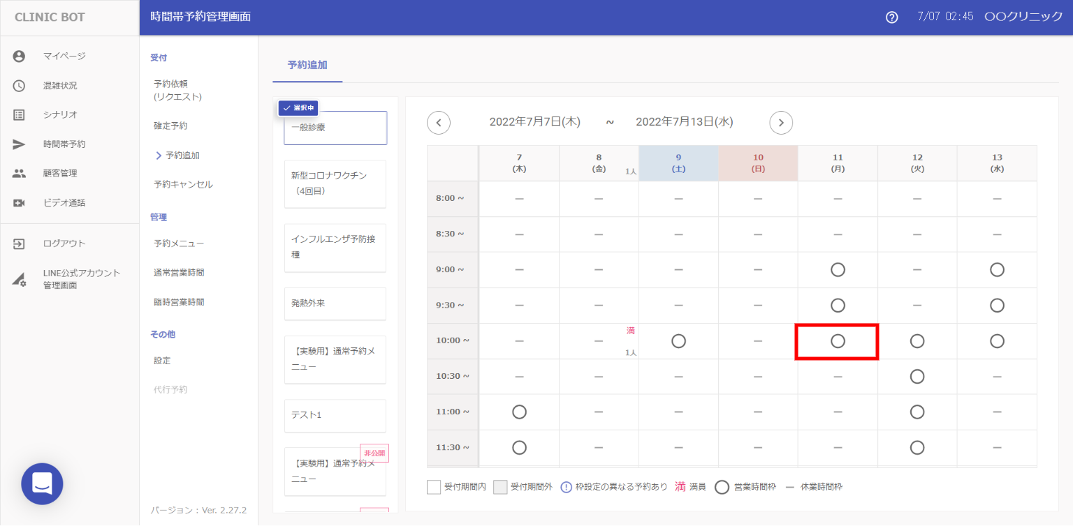 ①[時間帯予約]>[予約追加]から、追加する予約のメニューボタンを選択し、パネルから予約を追加する時間帯をクリックします。今回は、電話にて7月11日10:00~の時間帯予約枠に予約依頼が入ったとしましょう。