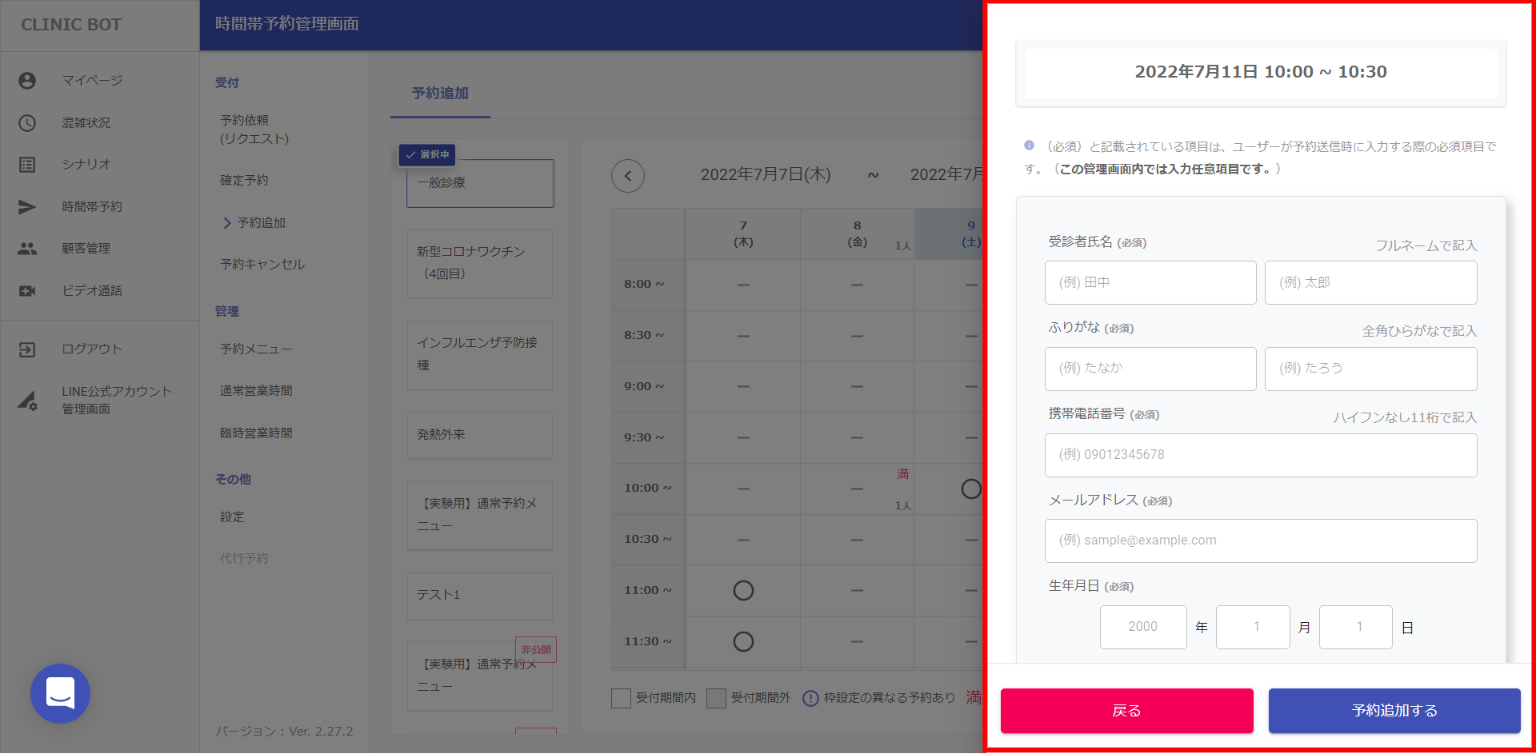 ユーザーの氏名だけを入力し予約追加をすることもできますし、すべて無入力でも予約を追加できます。入力が終了したら、[予約追加する]ボタンをクリックしましょう。