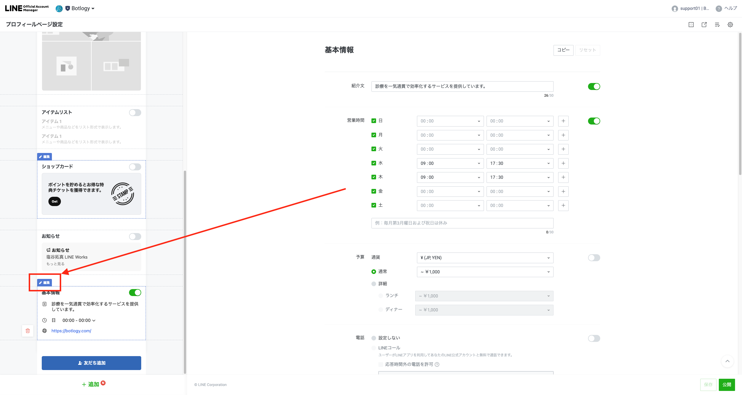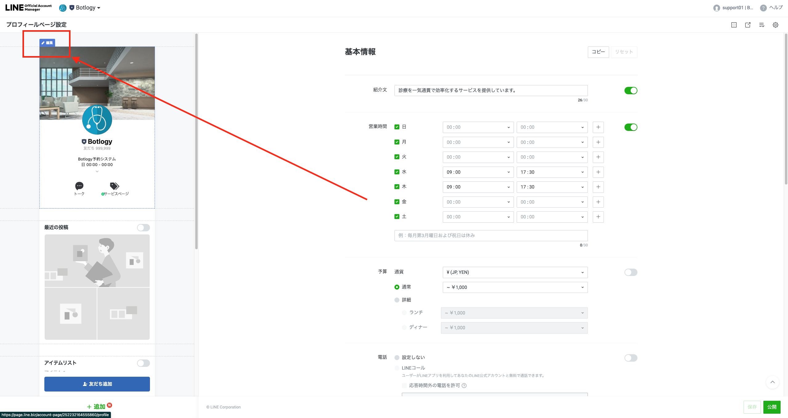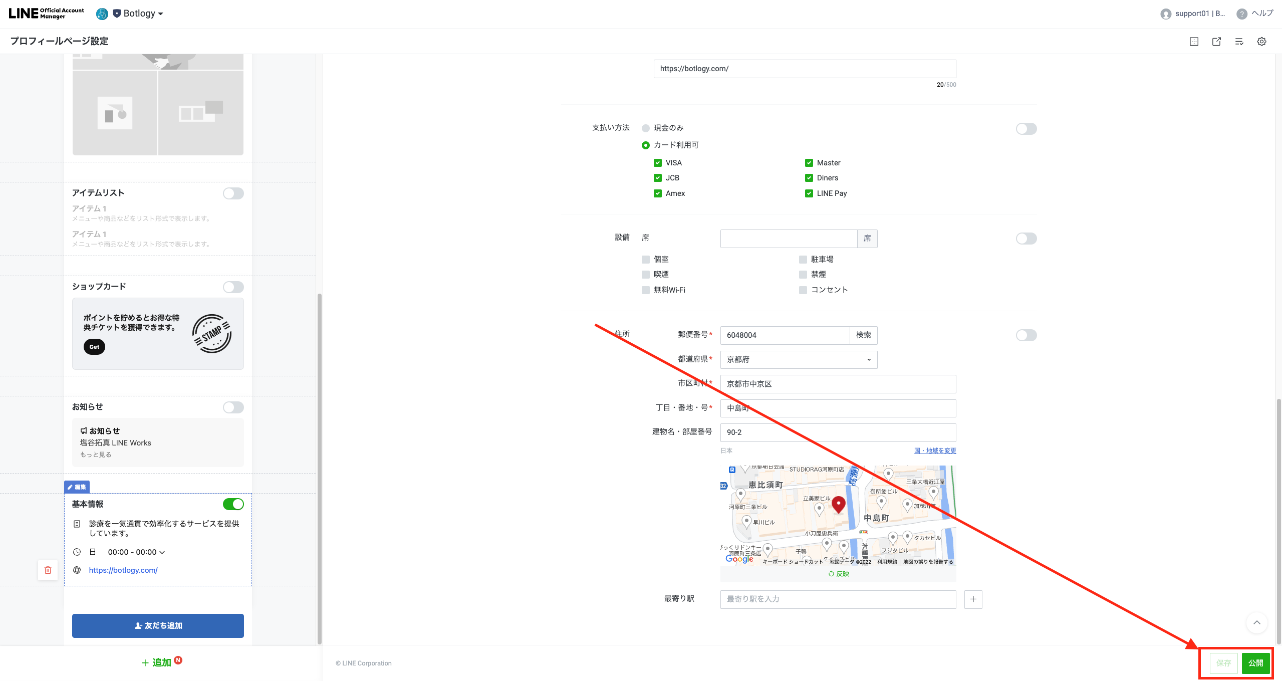 これらの入力後は、 [保存] ボタンをクリックした後、 [公開] ボタンをクリックしLINEアカウントに反映させてください。