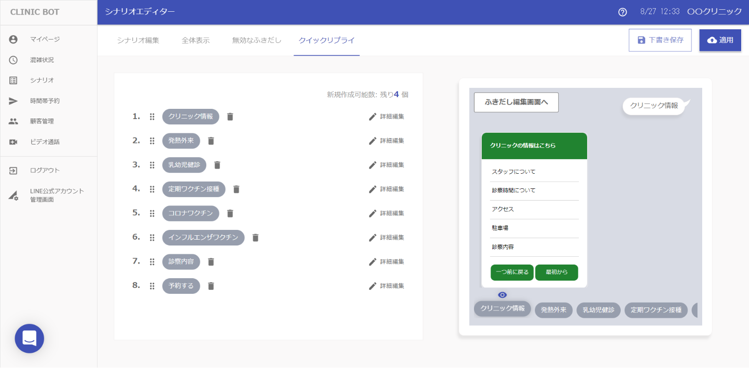 シナリオエディターでは、クイックリプライがどのように作動するかプレビュー表示で確認ができます。