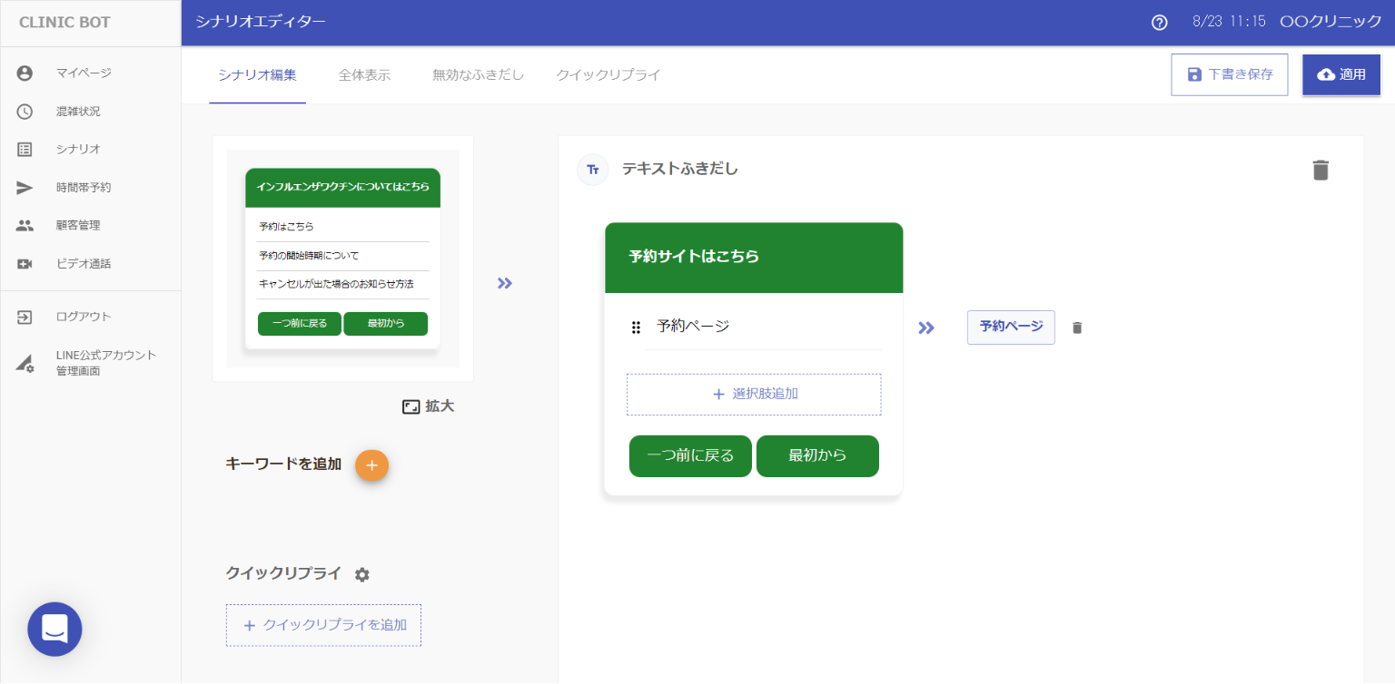 シナリオは、ユーザーへ質問を繰り返すことで最終的な情報まで誘導します。誘導先に予約ページがあると、患者様は予約を入れやすくなるでしょう。