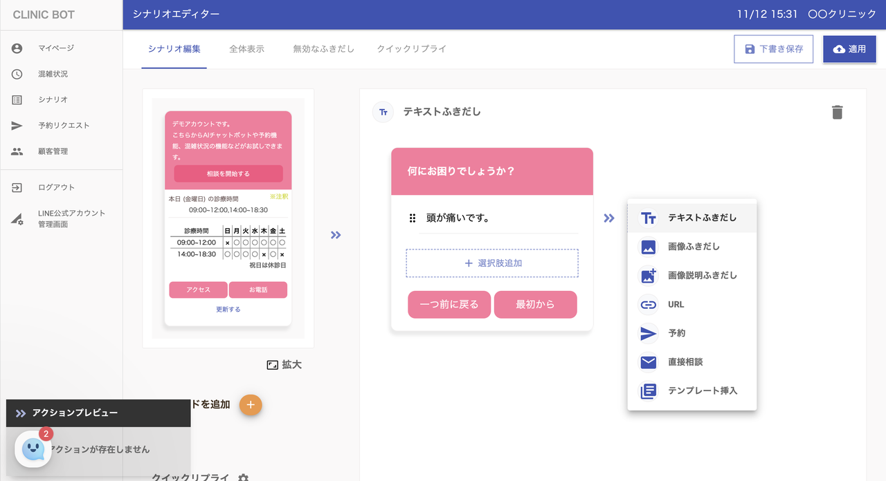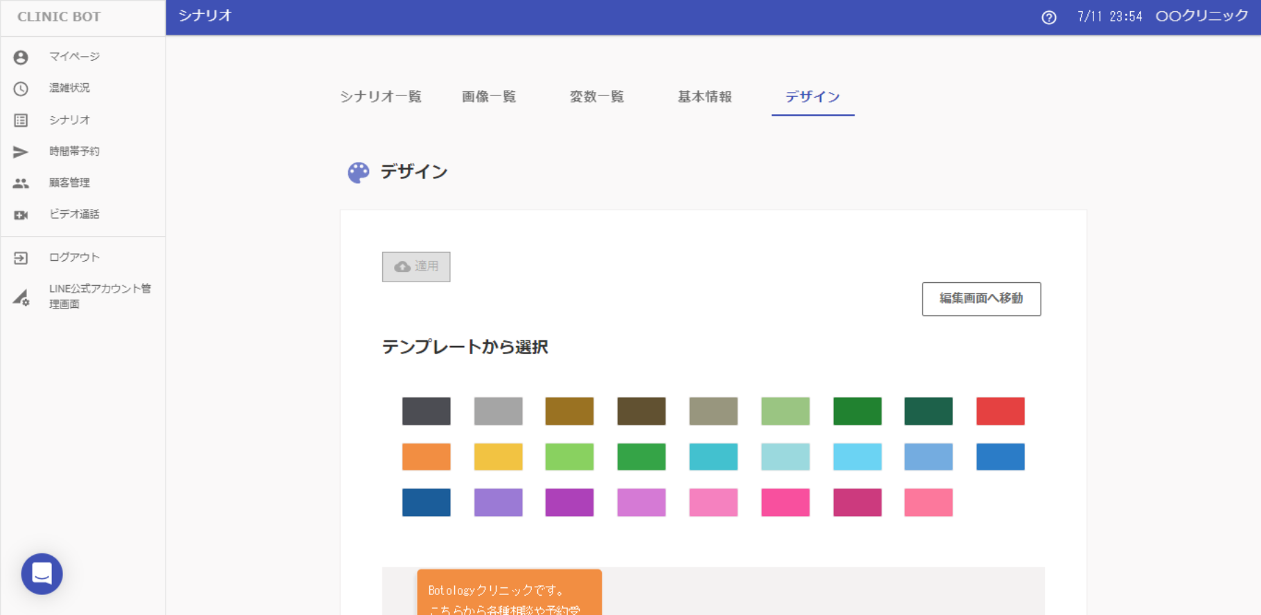 シナリオウィンドウの[デザイン]タブから、ふきだしの色やボタンの色を変更できます。クリニックのイメージにあった色に変更することを忘れないようにしましょう。