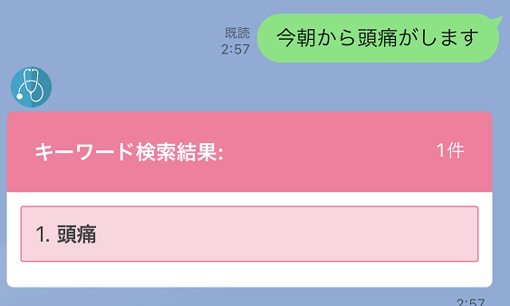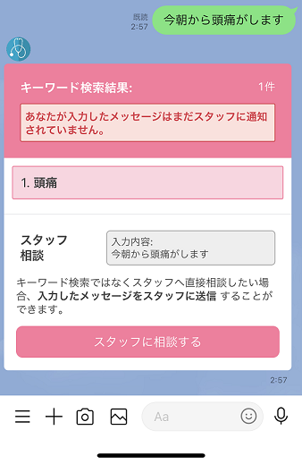 スタッフ相談機能をオンにしている場合と同様に、キーワード検索結果ふきだしの[1.頭痛]ボタンをクリックすることで、該当のふきだしが表示されます。