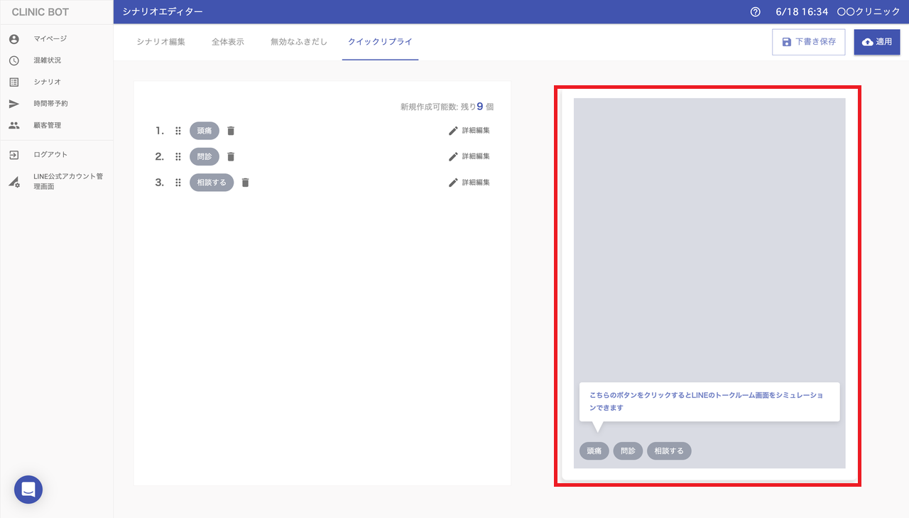 [ふきだし編集画面へ]ボタンをクリックすると、クイックリプライに紐づくシナリオの編集画面へ移動します。
