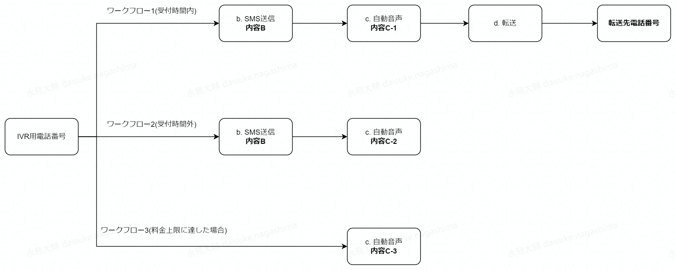 IVR(音声自動応答システム)は様々な設定があります。例えば、条件分岐を増やしダイヤルによってユーザーを分別する方法です。しかし、複雑な条件分岐が必要ない場合ダイヤルの入力はユーザーにとって煩雑な作業となります。そこで弊社では、簡潔なIVRシステムを開発しています。