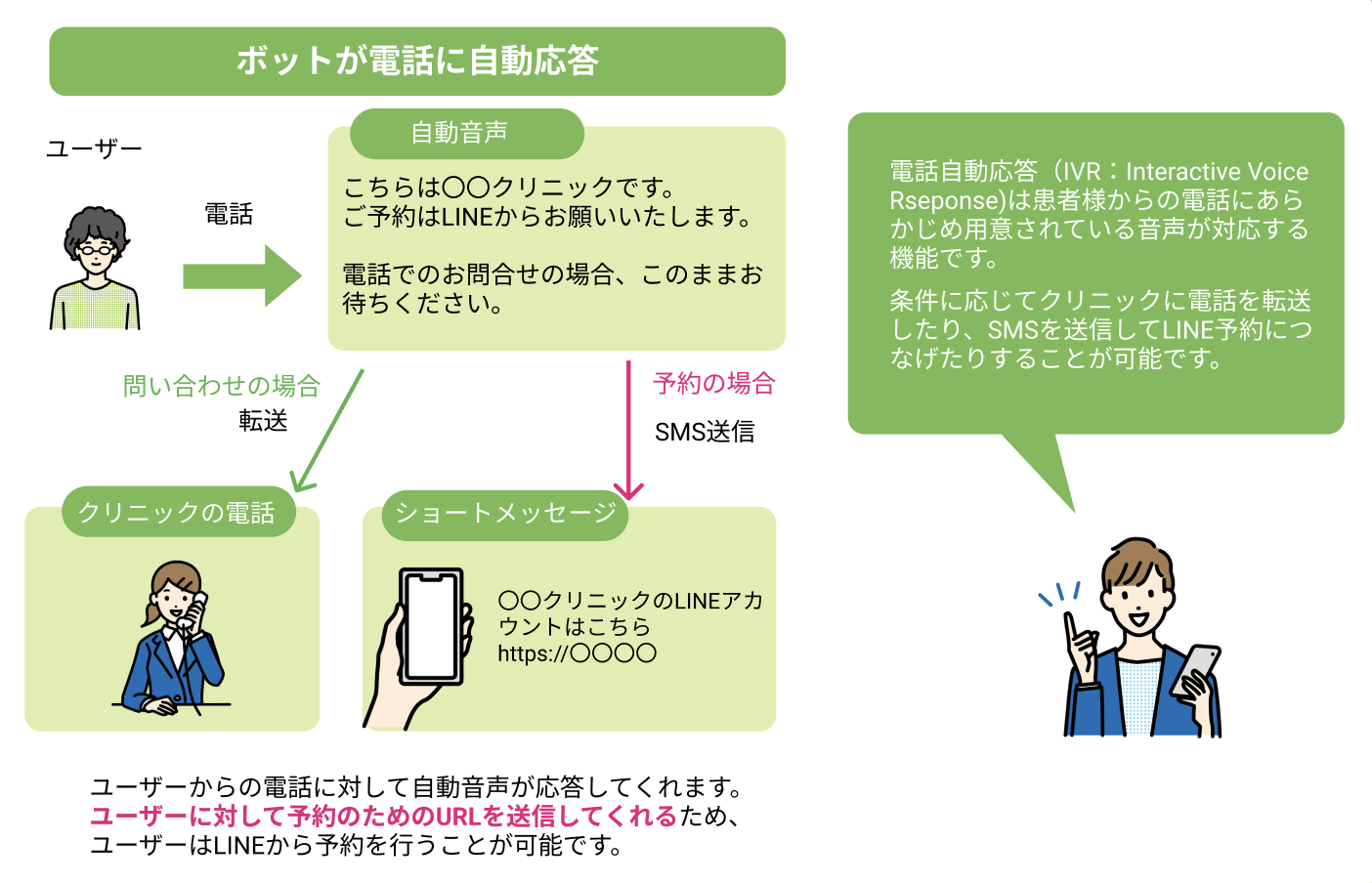 弊社のIVRのシステムは、受け付けた電話を予約受付と問い合わせに分別することができます。ユーザーの用件が予約の時には、ユーザーの電話番号にSMSでLINE公式アカウントのURLを送信することができ、問い合わせの場合はクリニックへ繋げることができます。以下のフローチャートのように、営業時間外にも音声対応することが出来ます。