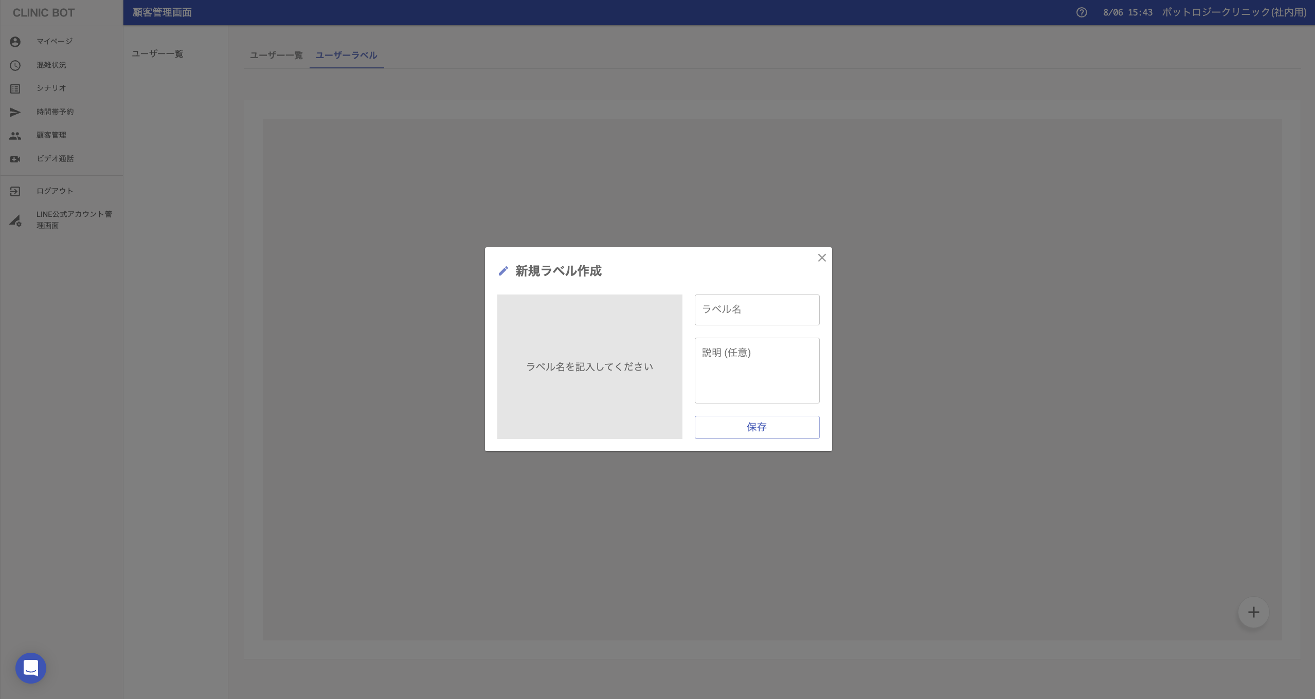 するとモーダルが表示されます。ラベルとはクリニックのスタッフ様用の識別用ですので、院内でわかりやすい名称、画像、説明を入力してください。