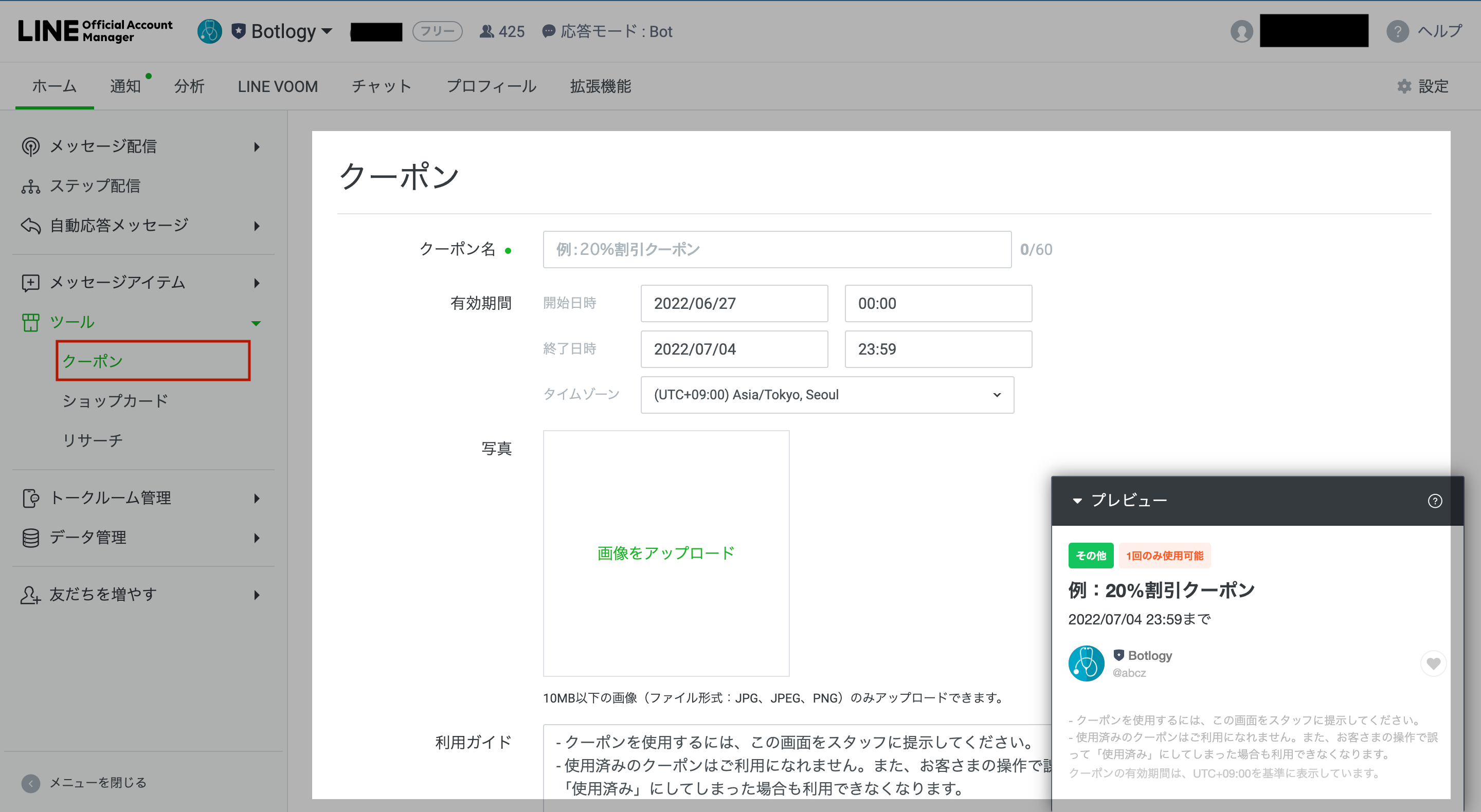 - 詳細設定(抽選、公開設定、使用可能回数、クーポンコード、クーポンタイプ)