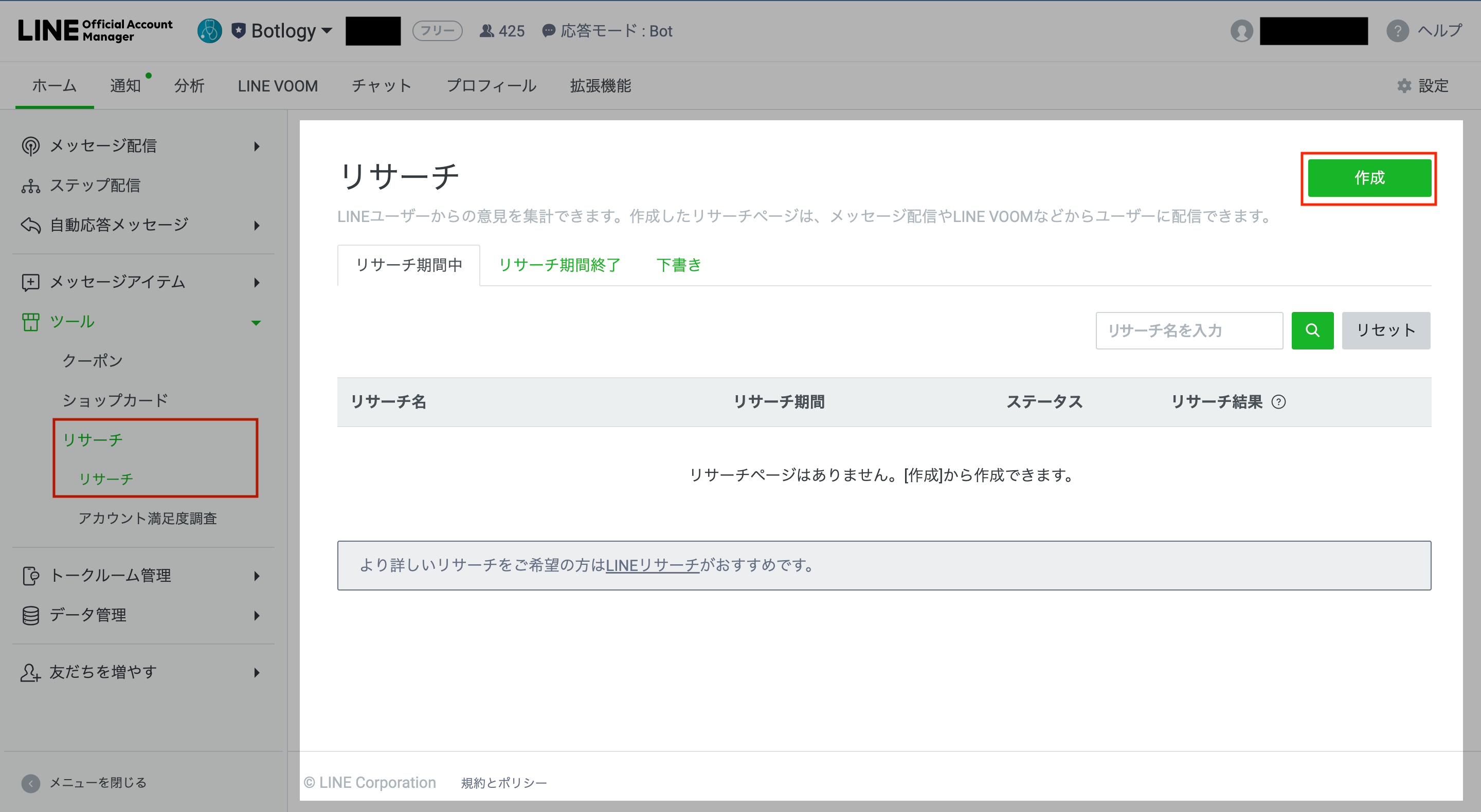 ➊ツール機能編集画面の[ツール]>[リサーチ]よりリサーチ機能の編集ウィンドウが表示され、[作成]を選択します。