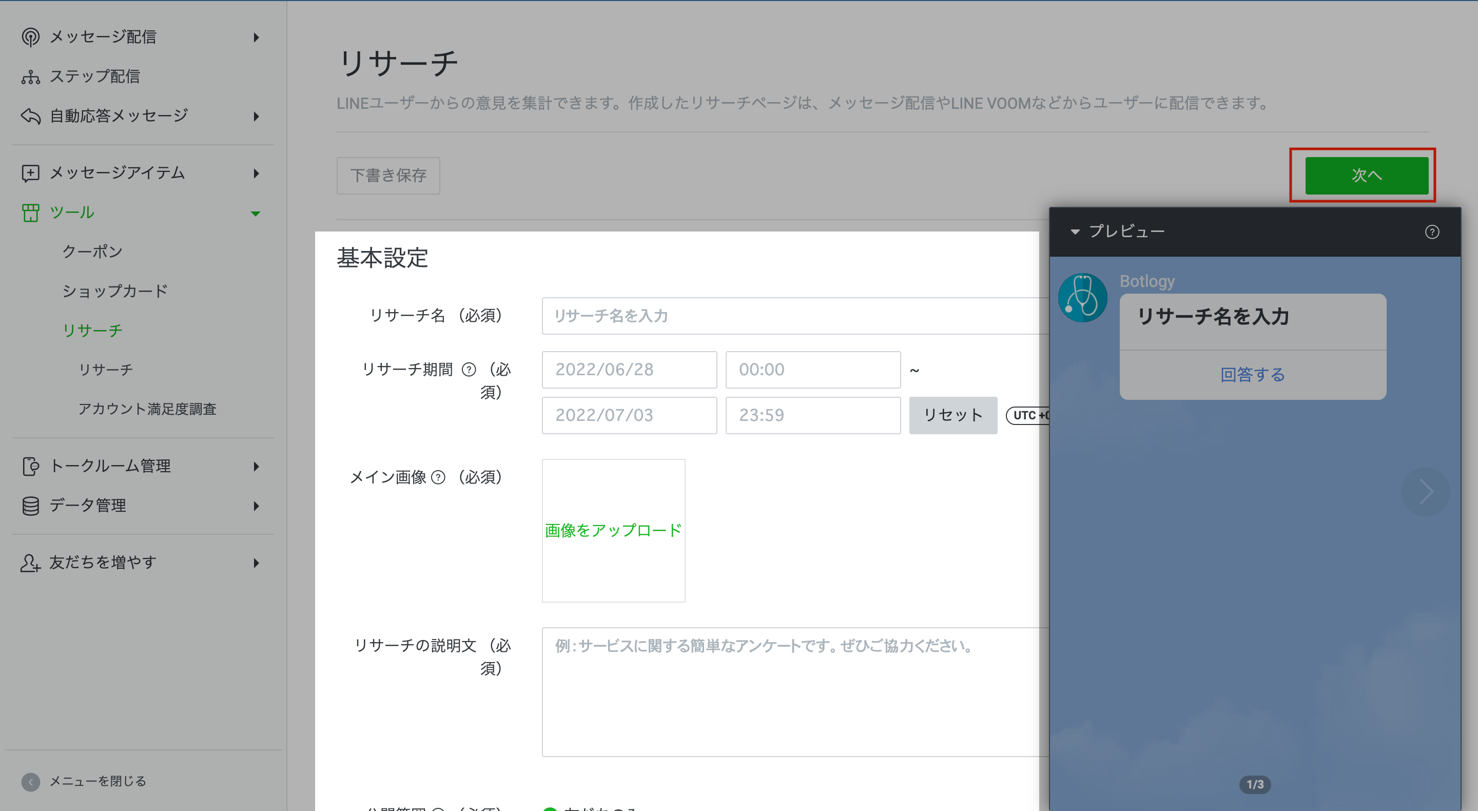 基本設定:リサーチ名、リサーチ期間、メイン画像、リサーチの説明文、公開範囲設定 紹介ページ設定:アイコン、トップページの画像、お問い合わせ先 |