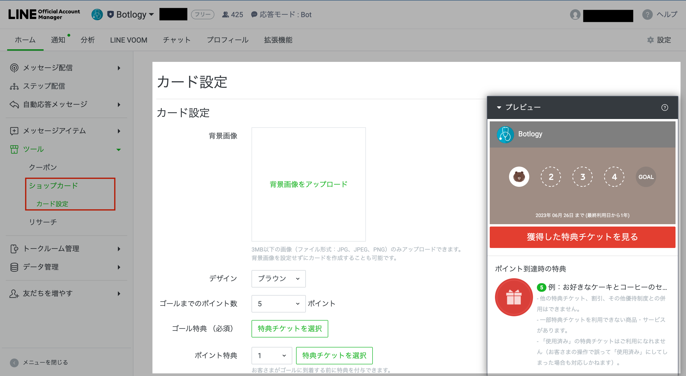 ➊ツール機能編集画面の[ツール]>[ショップカード]よりショップカード機能の編集ウィンドウが表示され、[ショップカードを作成]を選択します。