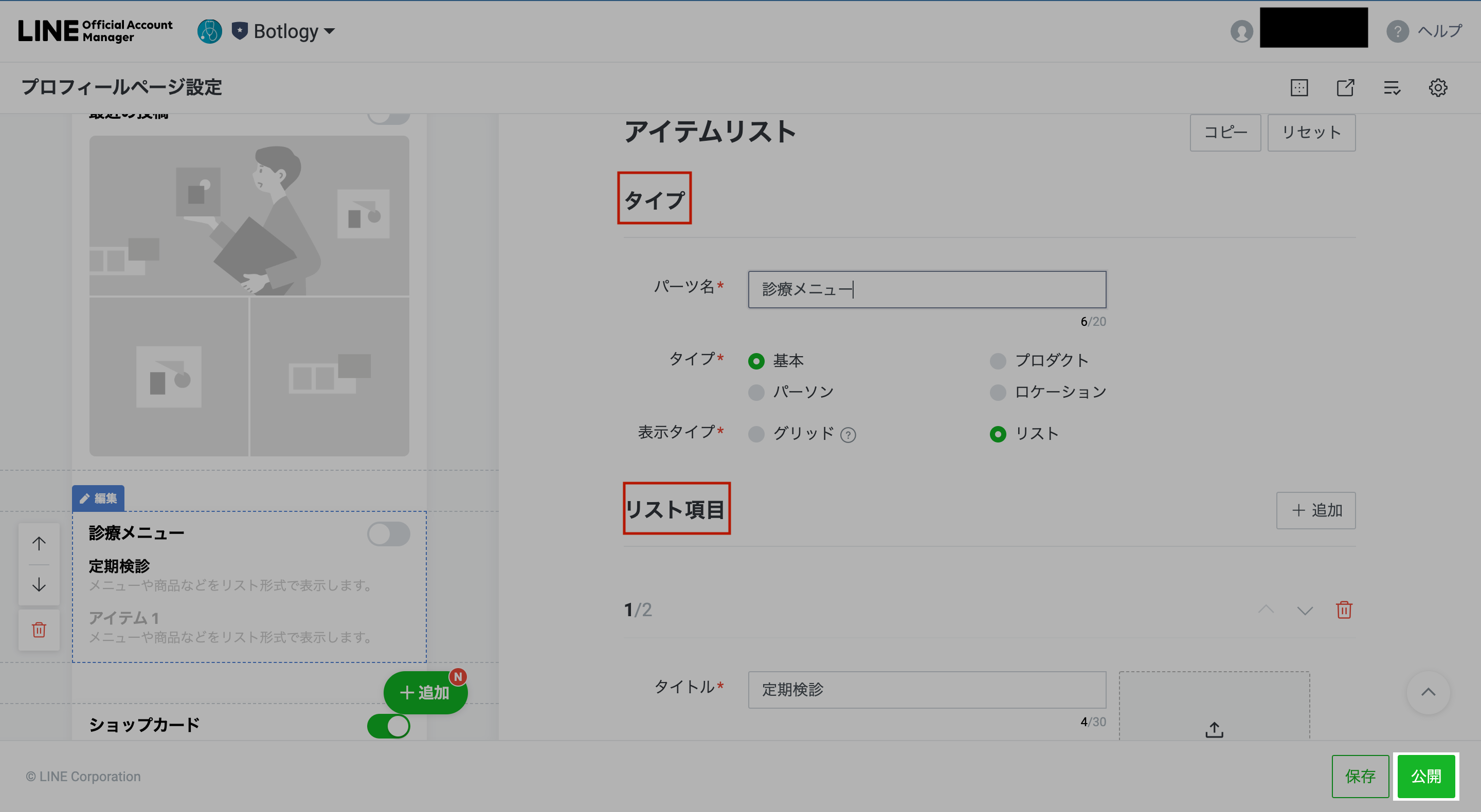 [タイプ]に表示形式の設定。[リスト項目]で診療メニューを最大2つ記入することができます。