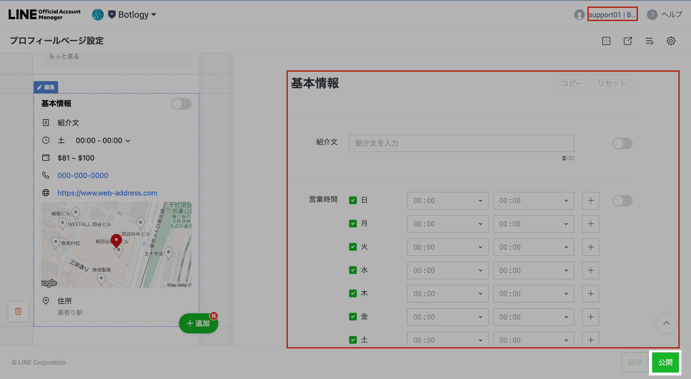 ❷各項目(赤線枠内最大2ヶ所)を記入後、[公開]をクリックすることで公開される。