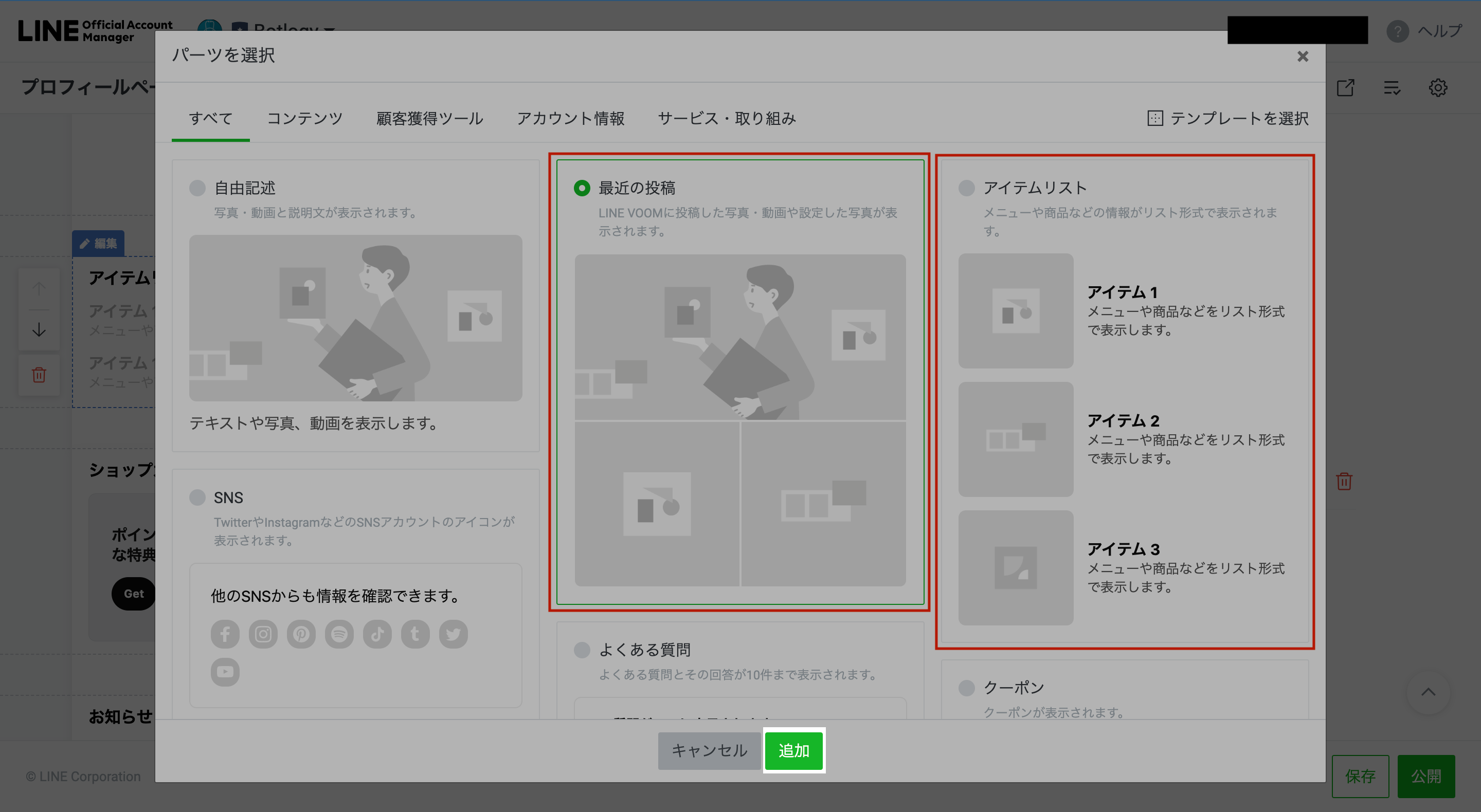 プロフィールページ設定画面>パーツの追加までの進み方LINE公式アカウント管理画面(LOAM)を開く。[プロフィール]より、プロフィールページ設定ページに移動。ページ左部のサイドバー[追加]をタップ。以下、次の画像中の[最近の投稿]と[アイテムリスト]をつかいます。 |