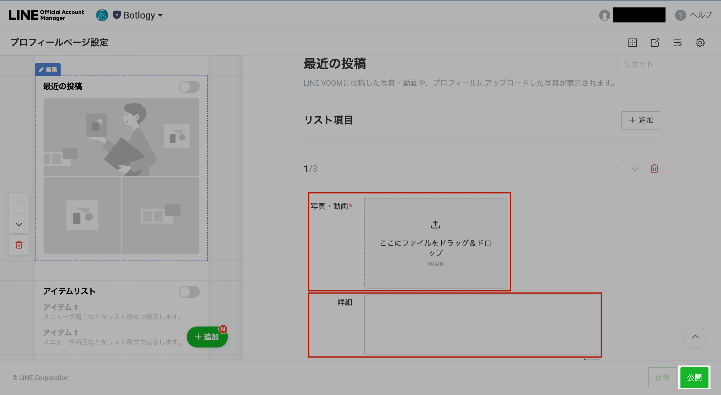 最近の投稿には、「LINE VOOMに投稿した写真・動画」と「プロフィールにアップロードした写真・動画」が表示されます。クリニック様がLINE VOOMを使わずプロフィールのみに、何か情報を投稿したい際、以下の「最近の投稿」から設定することができます。