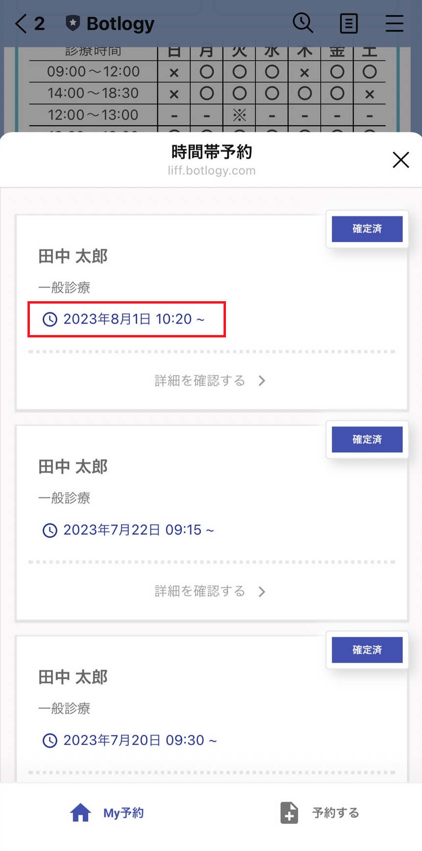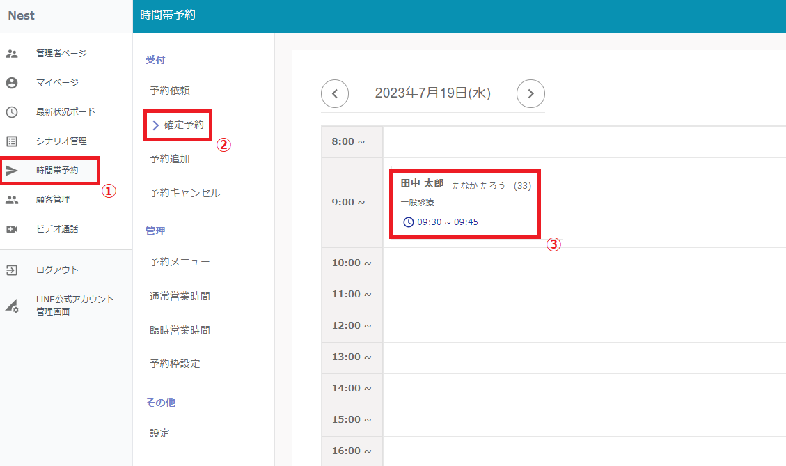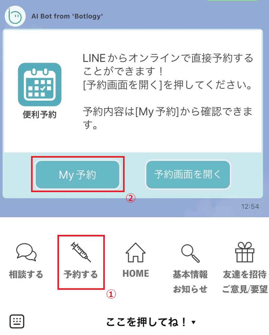 ①LINEトークルームより、下記手順で対象の予約を確認する。