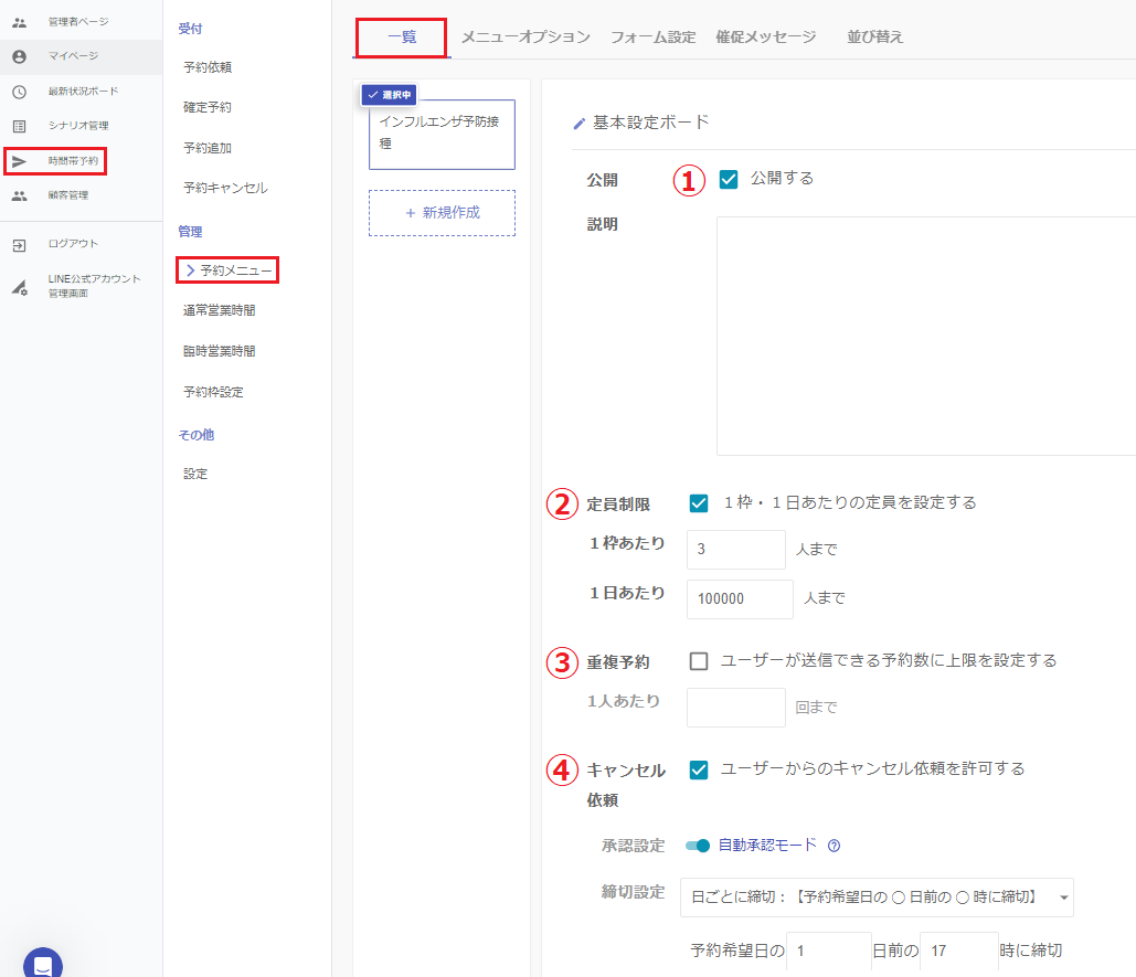 ・承認設定⇒チェックを入れ自動承認とする(患者様がLINEで予約キャンセルできるようになります)