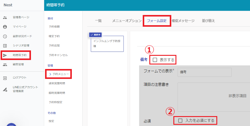 ①チェックを入れると、患者様の予約時のフォームに表示されます。