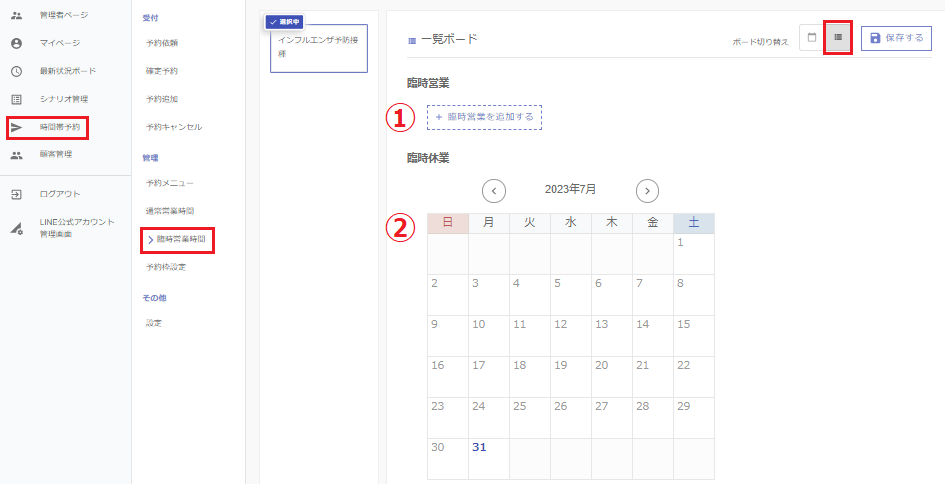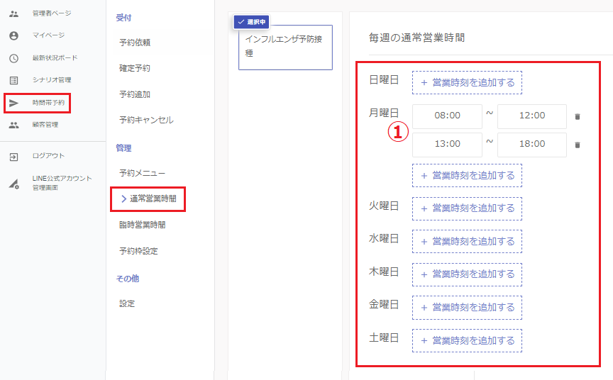 ①こちらから任意の時間を予約の受付時間として追加できます。