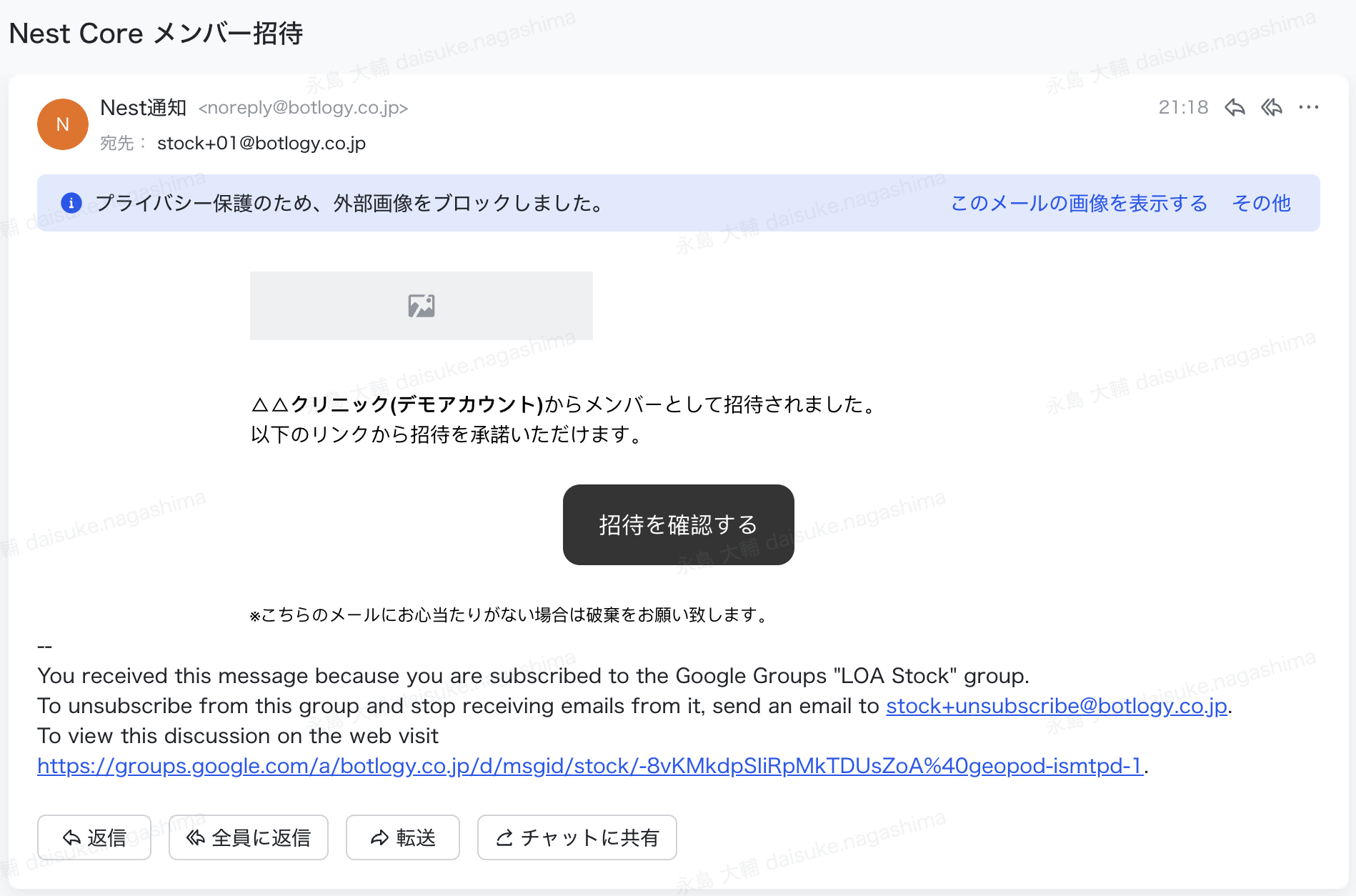 - 該当のメールアドレスにメンバー招待の確認メールが届くので、[招待を確認する]ボタンをクリックする。