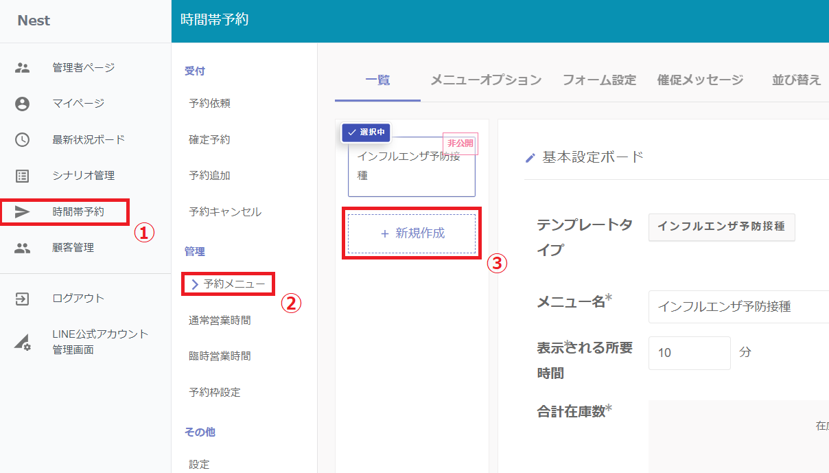 「作成」ボタンを押し、予約メニューの作成は完了です。下記の「定員制限・キャンセル設定(患者様からの)」にお進みください。