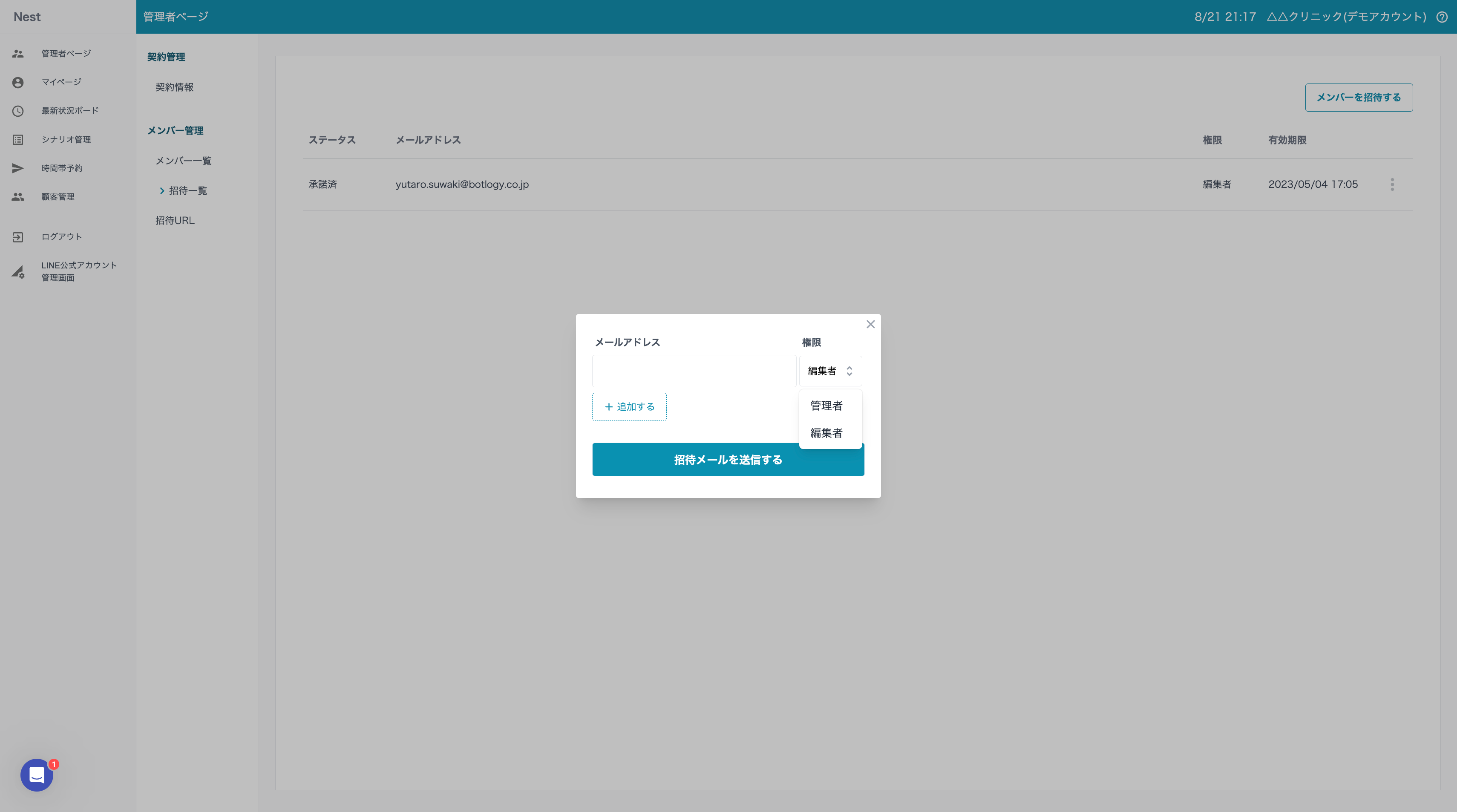 - 招待したいユーザーのメールアドレスを入力し、権限を選択する。