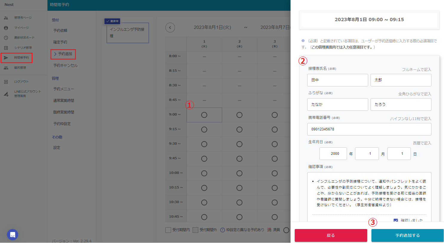 ③項目の入力が完了したら、「予約追加する」をクリックし、予約追加は完了です。