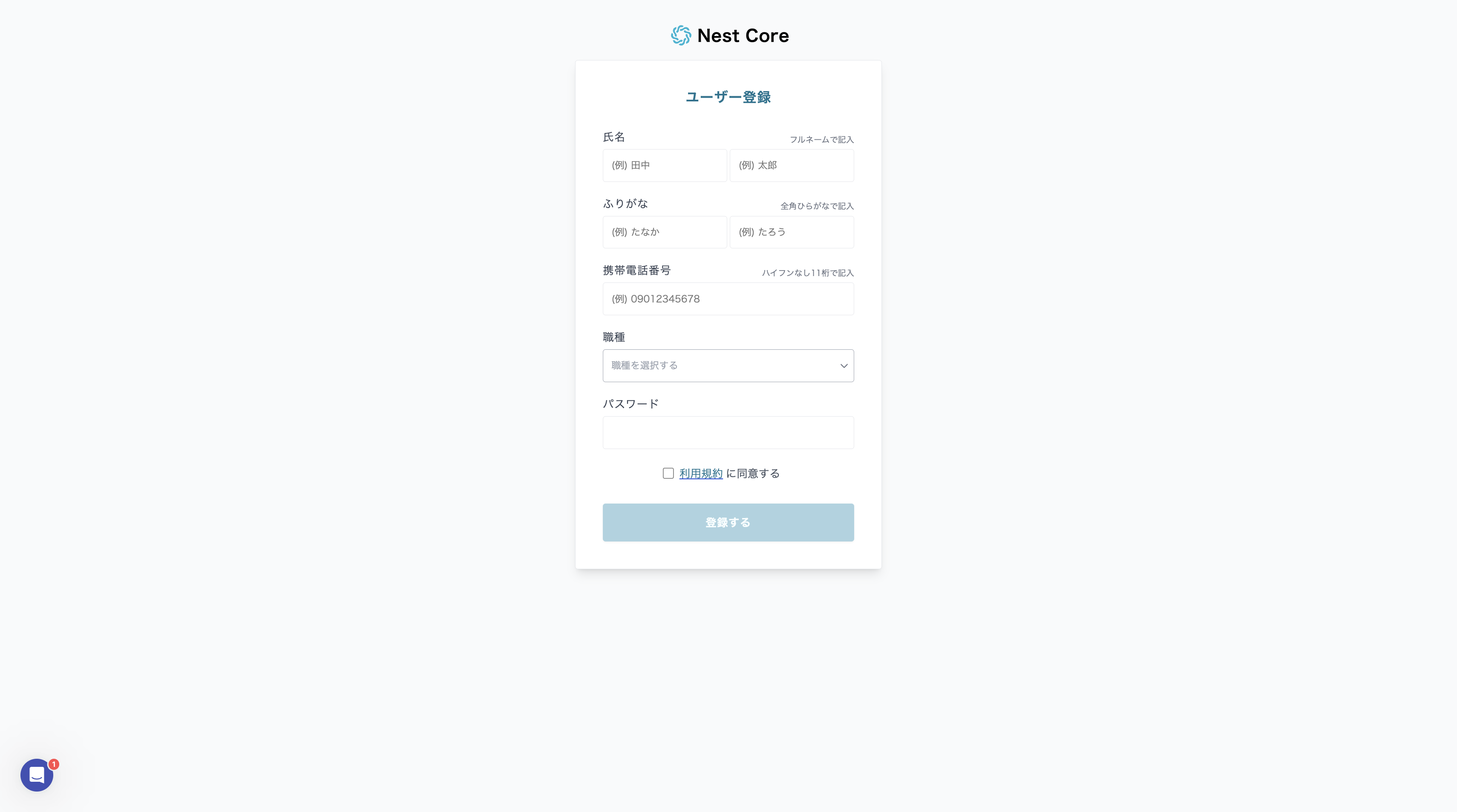 - その後、ユーザー登録として、氏名、ふりがな、携帯電話番号、職種、パスワードを入力し、利用規約に同意するにチェックを入れて、[登録する]をクリックすると完了。