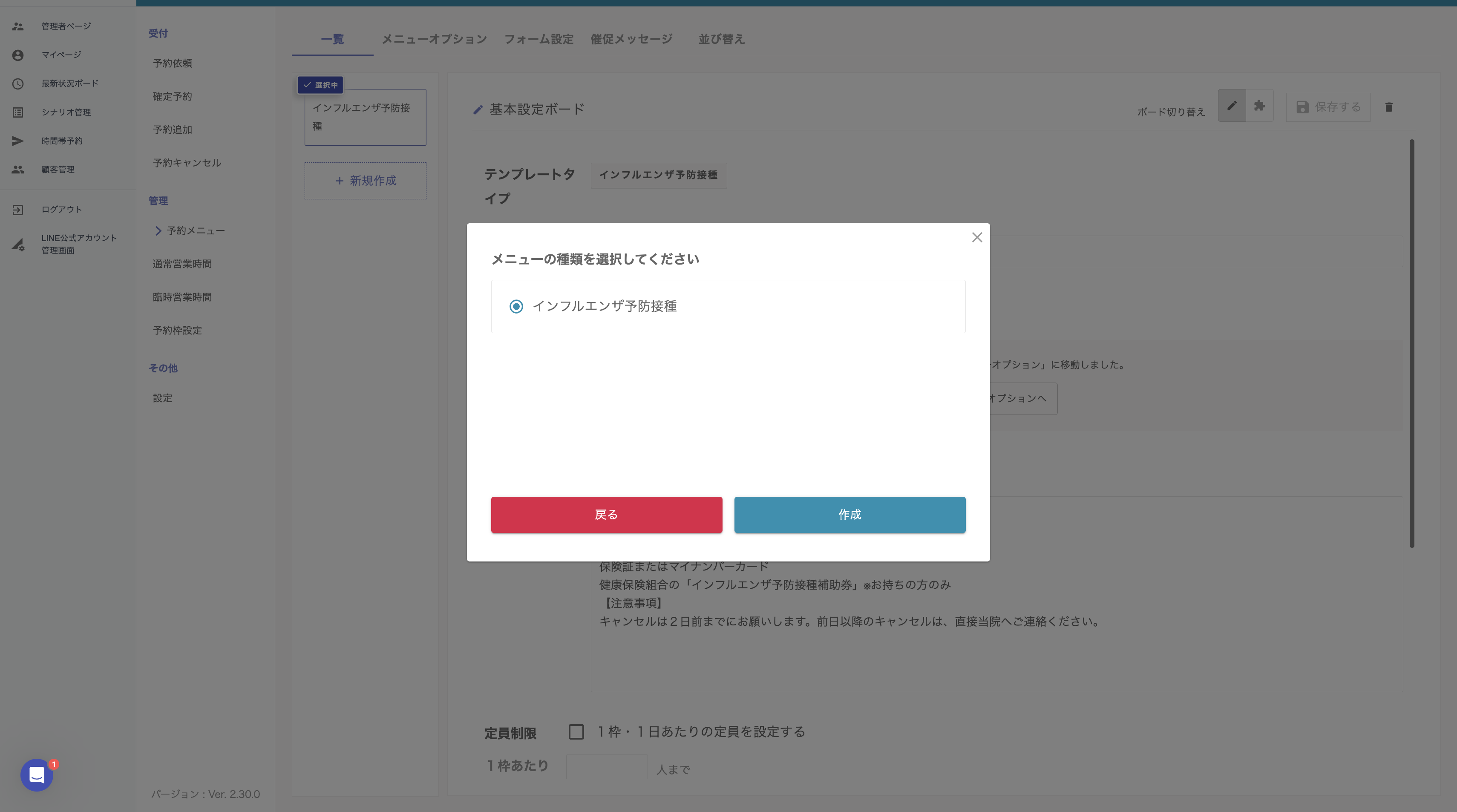 メニューの種類から「インフルエンザ予防接種」を選択してください。(無料版は「インフルエンザ予防接種」メニューのみ作成いただけます。)