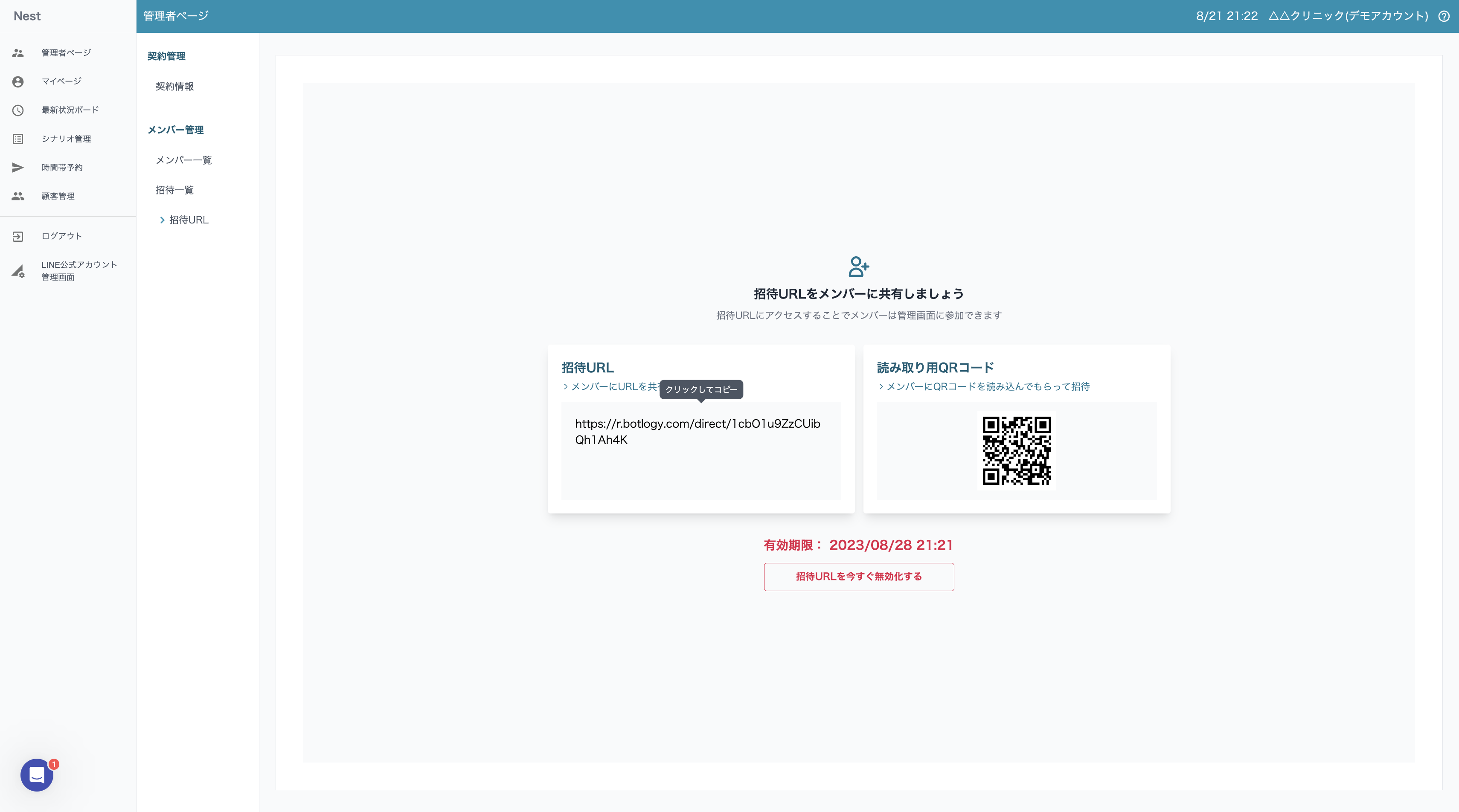 - 招待URLまたは読み取り用QRコードを招待したいスタッフ様に共有する。