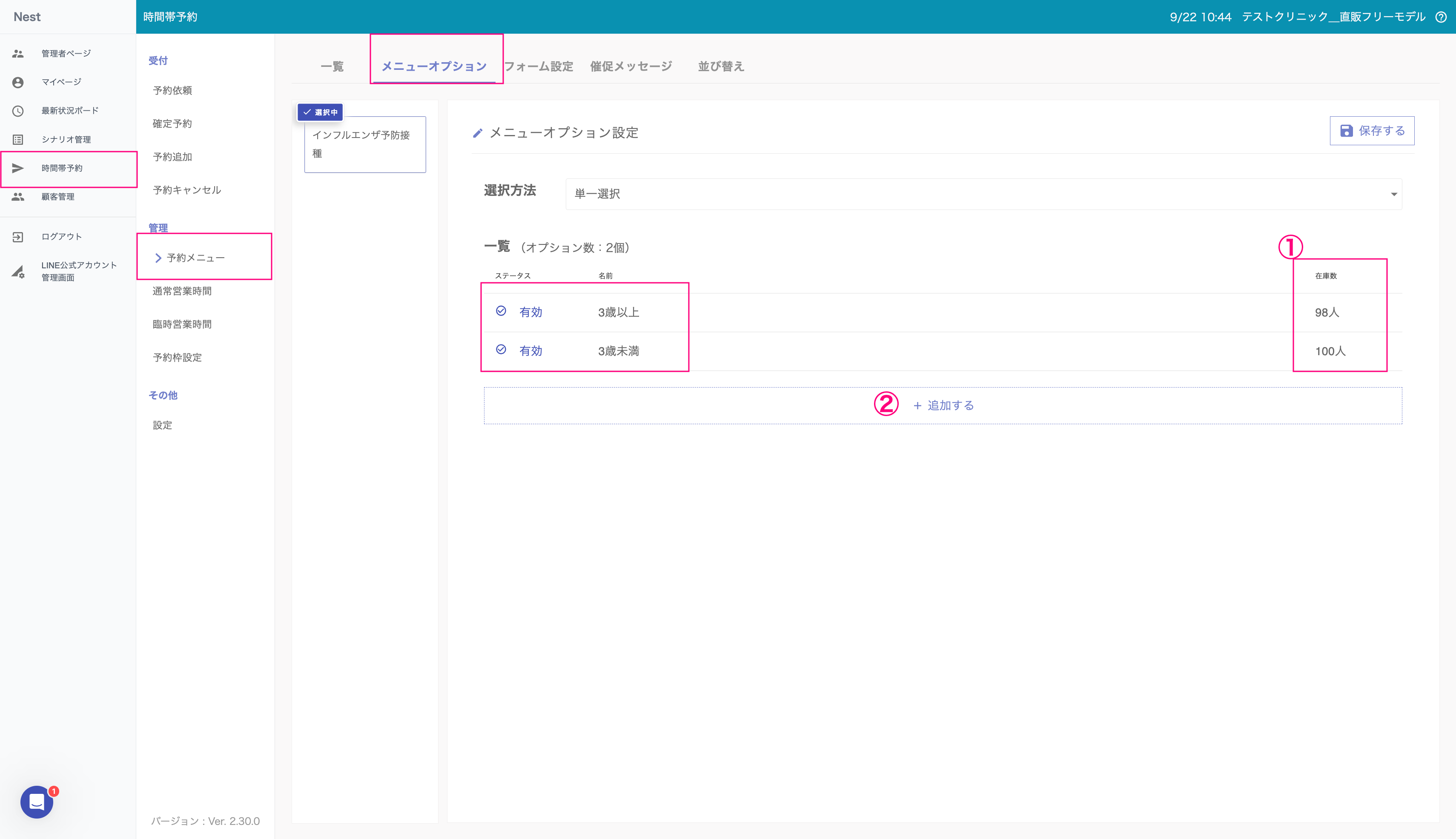 下図①、こちらでワクチンの在庫確認が可能です。単位は接種可能人数です。接種時ではなく、予約が入った時点で個数が減算される仕組みです。そのため、キャンセルになった場合は、システム内でもキャンセルの反映を行ってください。(※別資料参照「予約のキャンセル」)