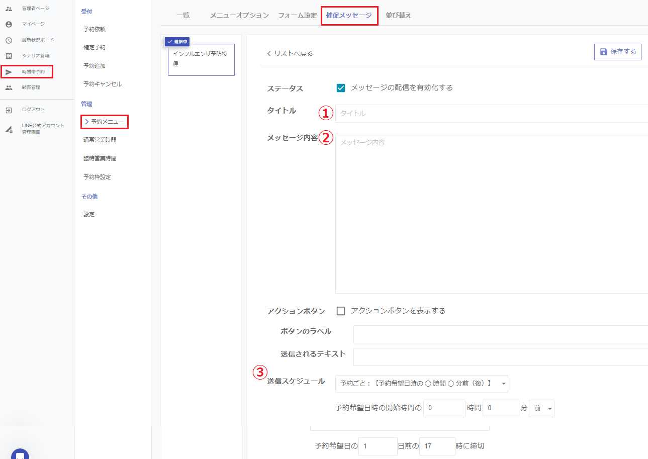 ③催促メッセージの送信タイミングを入力してください。前日の夕方などが有効です。