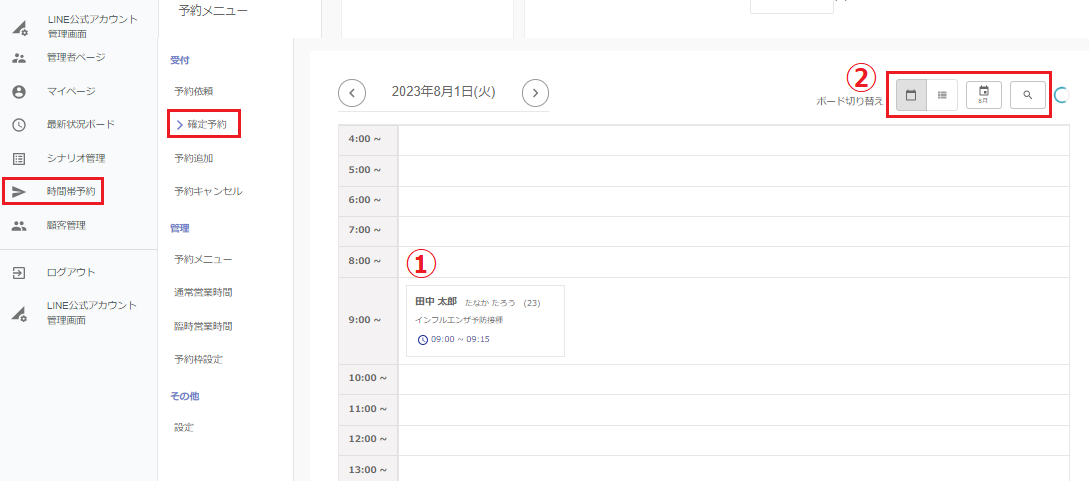①こちらで予約の確認が可能です。「予約メニュー」毎にフィルタしての閲覧も可能です。
