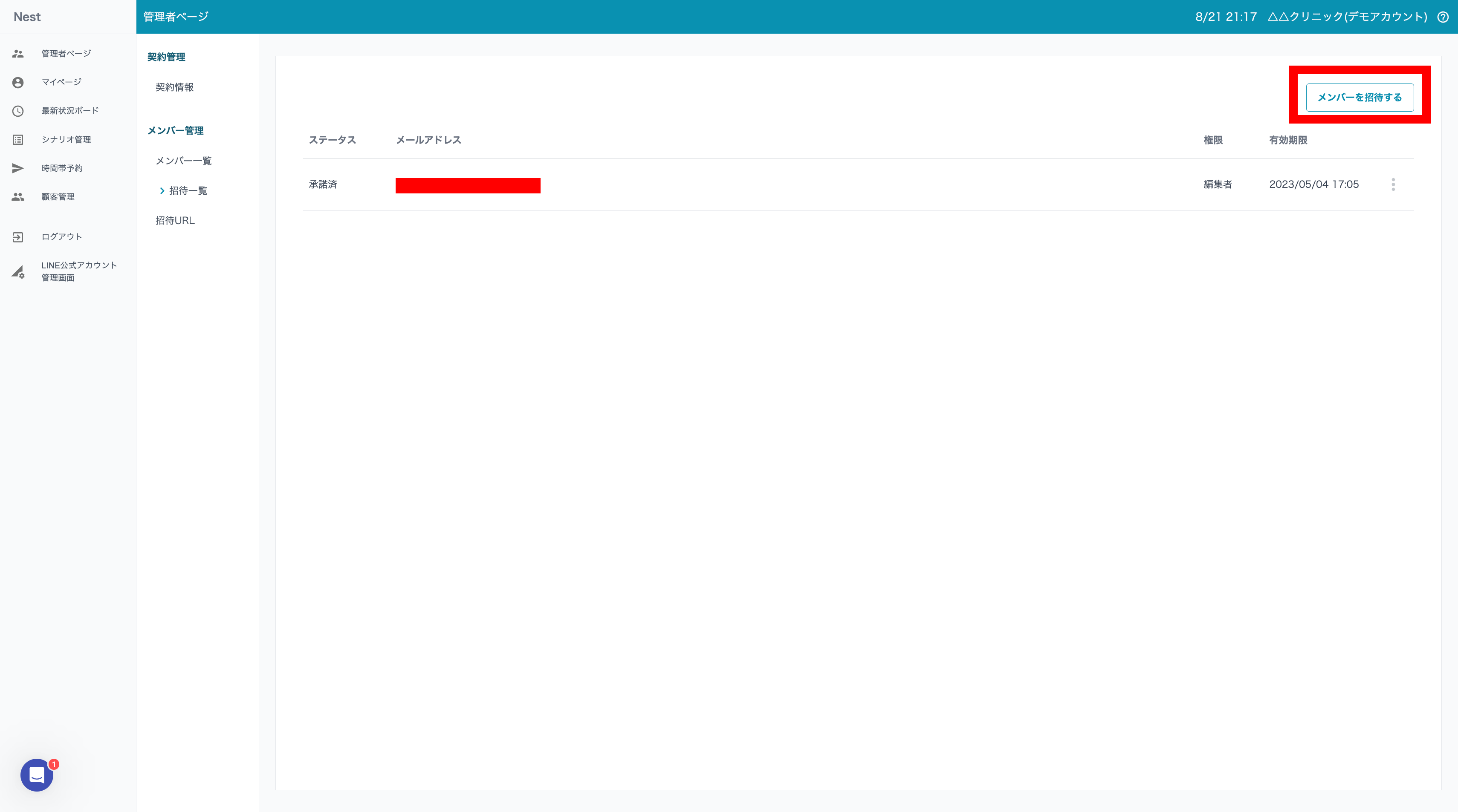 - 管理者や所有者ユーザーが、[管理者ページ] > [メンバー一覧]or[招待一覧]ウィンドウの右上[メンバーを招待する]ボタンをクリックする