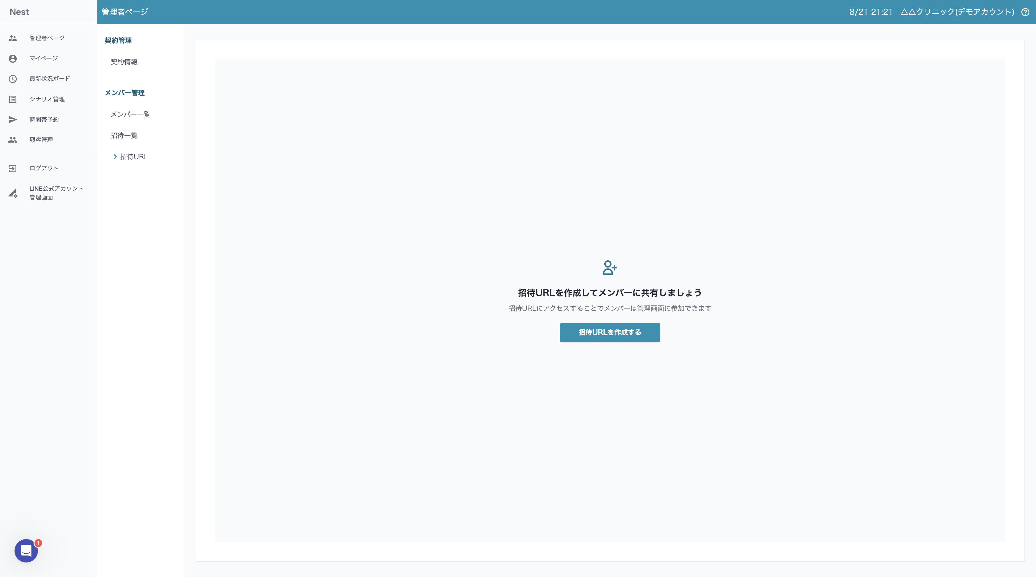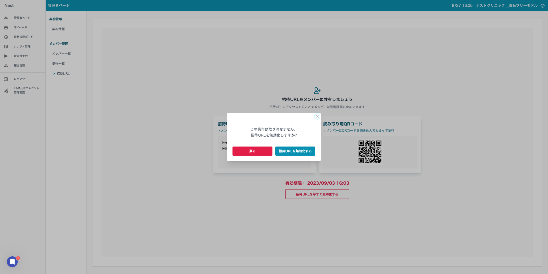 招待URLは医療機関と無関係の第三者に共有しないよう、厳重に取り扱ってください。また、漏洩してしまった可能性がある場合には、画面の[招待URLを今すぐ無効化する]をクリックしていただき、招待URLをすぐに無効化することができます。