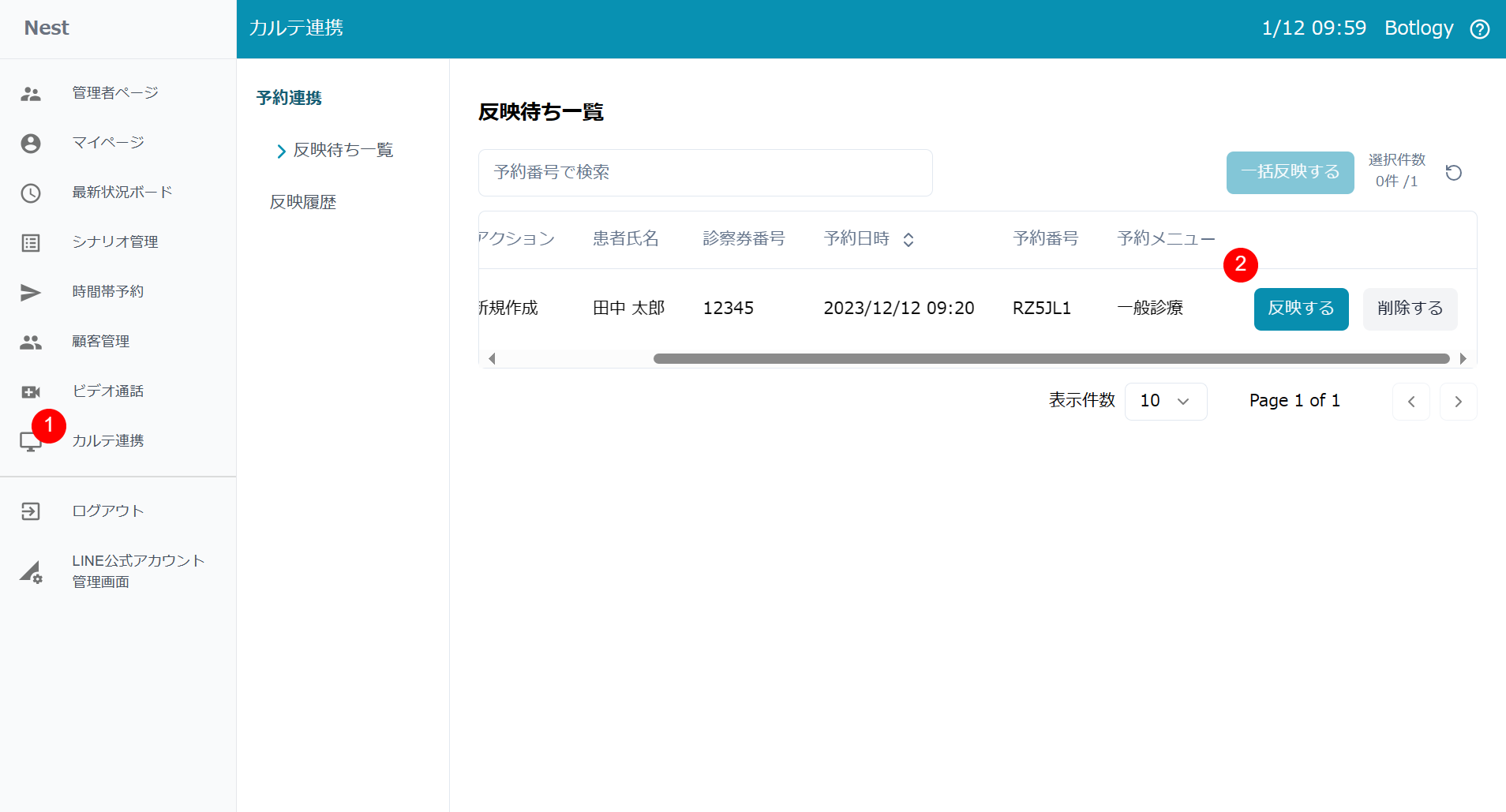 - Nest診療管理画面の[カルテ連携]>[反映待ち一覧]を開きます。