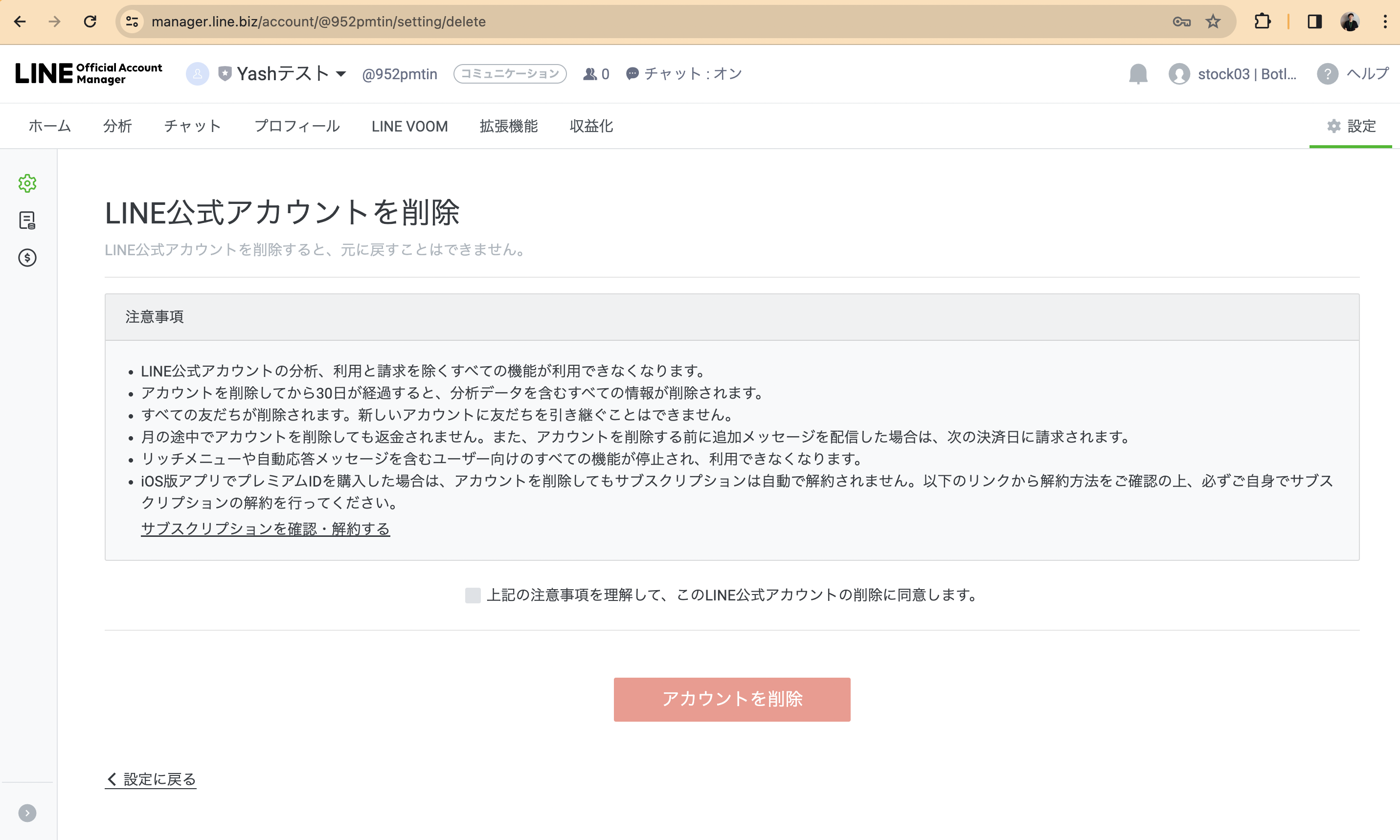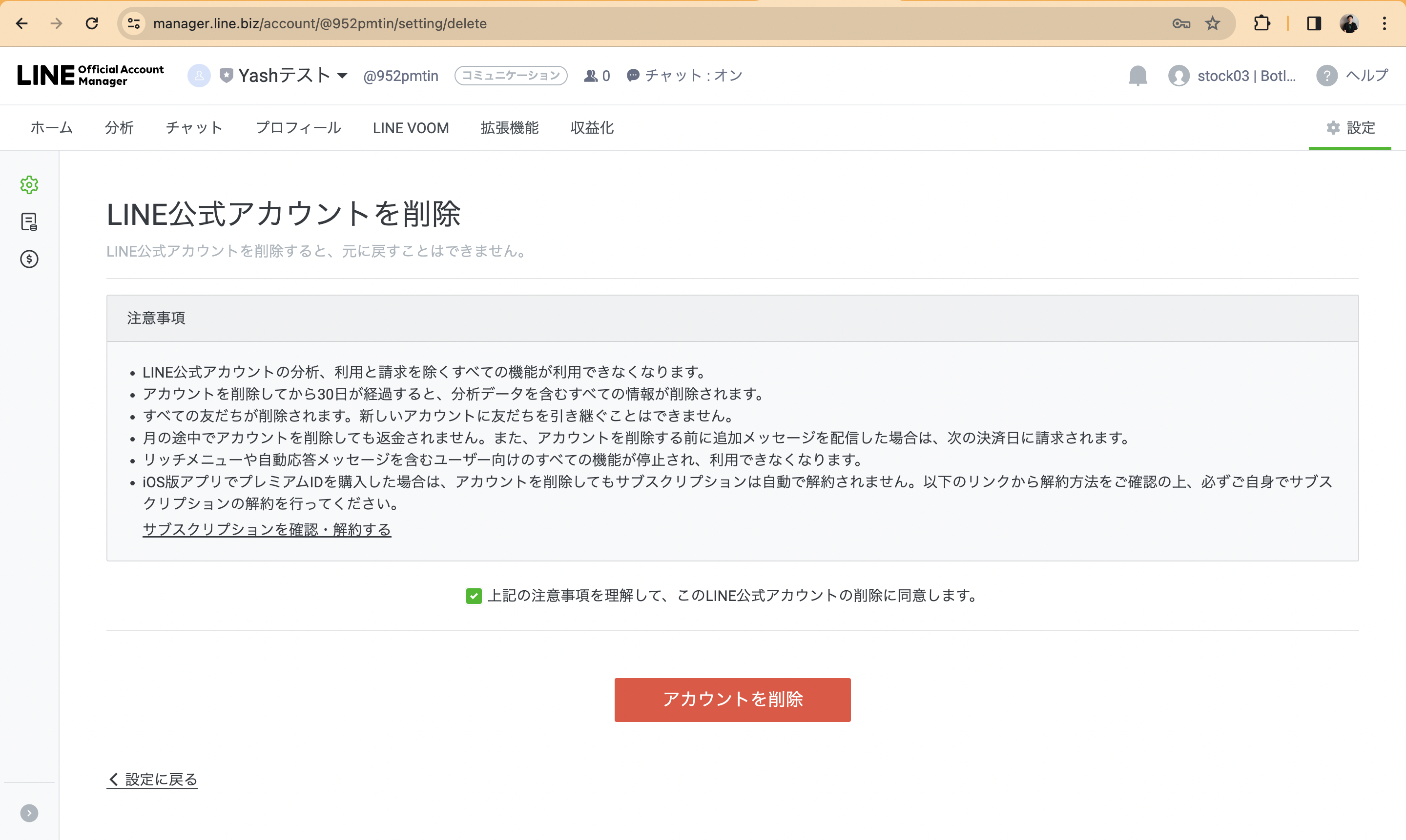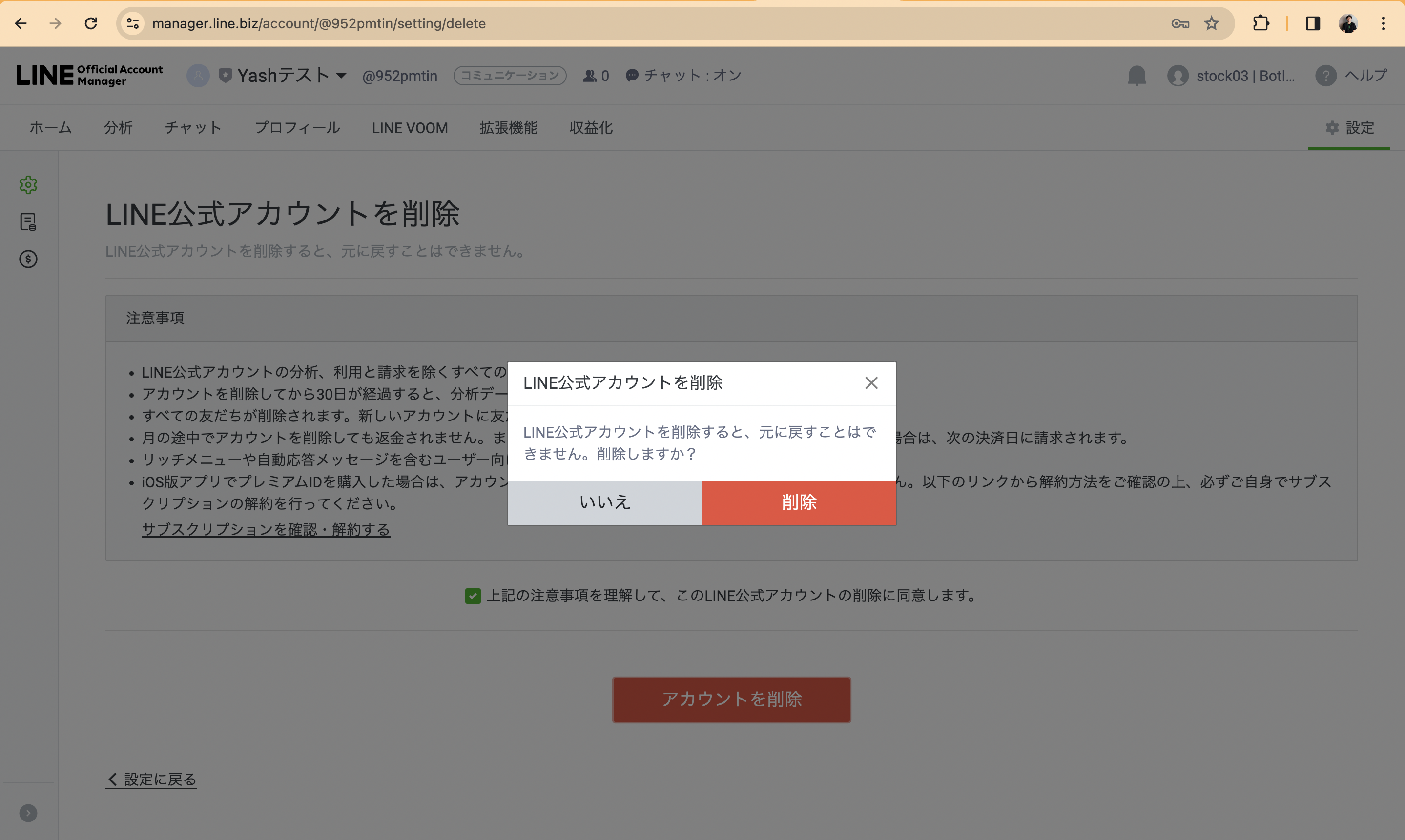 6. "アカウントを削除"ボタンをクリックすると、最終確認画面へ