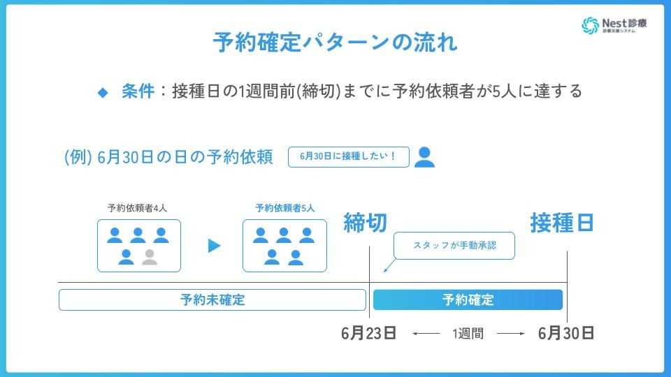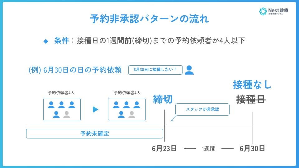 (例) 6月30日の日の予約依頼があり、接種日の1週間前(締切)までの予約依頼者が4人以下の時