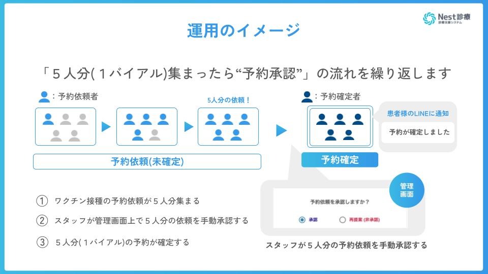 患者様がLINEから予約依頼→スタッフが「5人分(1バイアル)集まったら“予約承認し、発注”」の流れを繰り返します。